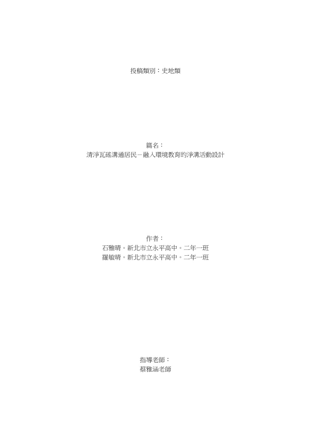 作者以河川與人類自古至今的關係出發,思考現今雙和地區的瓦磘溝髒亂惡臭,進而提出調查瓦磘溝汙染源的構想,發展出具有環境特色與教育意涵的淨溝活動,並以實際行動,邀請永和的民眾一同參與。