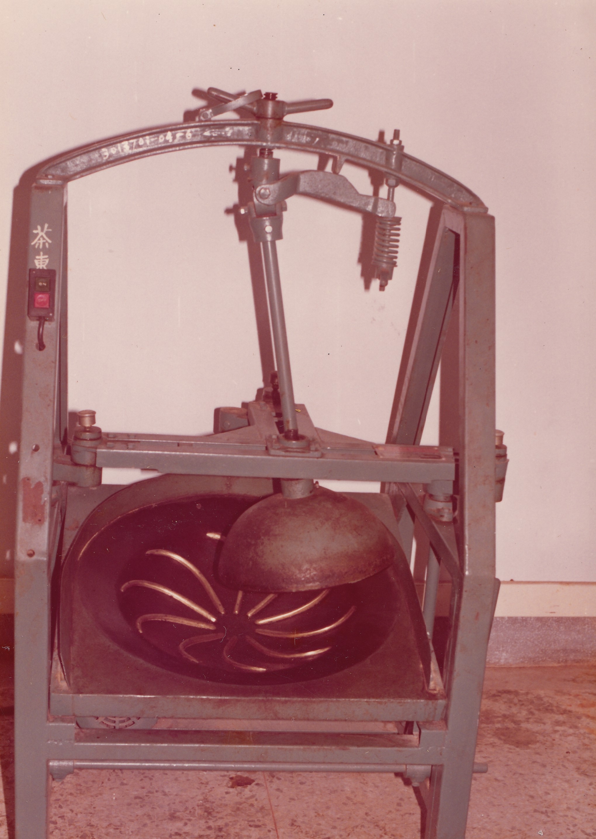 照片主題為民國70年代時茶業改良場臺東分場剛開始投入製茶試驗時使用的望月式揉捻機,用來進行茶葉的揉捻。