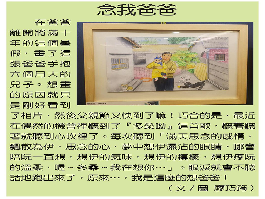 廖巧筠在〔念我爸爸〕的作品介紹中寫道:『在爸爸離開將滿十年的這個暑假,畫了這張爸爸手抱六個月大的兒子。在偶然的機會裡聽到了『多桑呦』這首歌,眼淚就會不聽話的跑出來了,原來……,我是這麼的想爸爸啊!』