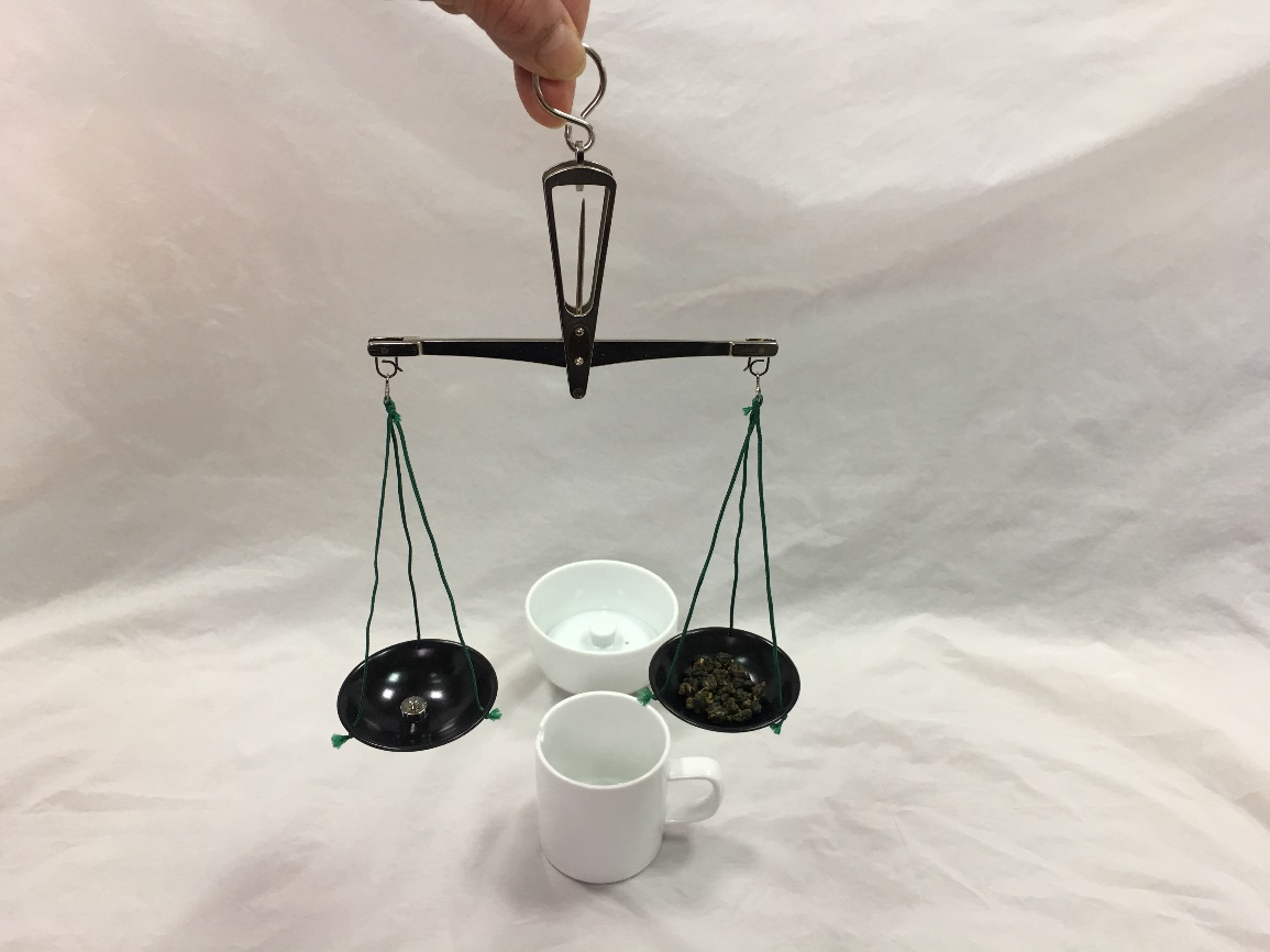手持式天平秤是利用槓桿原理,與一般市售桌上型天平秤一樣,但為了茶葉競賽上百甚至上千茶樣的快準秤樣零誤差而特地改良為手持式,一邊3公克砝碼另一邊秤取茶樣,維持水平時就同樣是3公克,困難度相當高,因此,競賽場合上的秤茶師都是專業級的熟面孔,容不得取樣秤樣有任何誤差,一有失誤可能就與冠軍失之交臂喔!