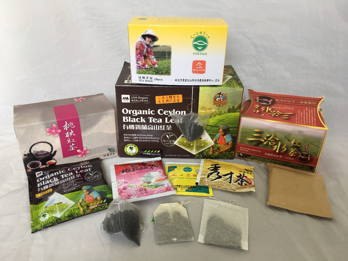 照片為各式各樣的袋茶,有不織布包裝,有立體包,一包袋茶放入茶杯中,熱水沖泡馬上就有一杯茶飲可以飲用。