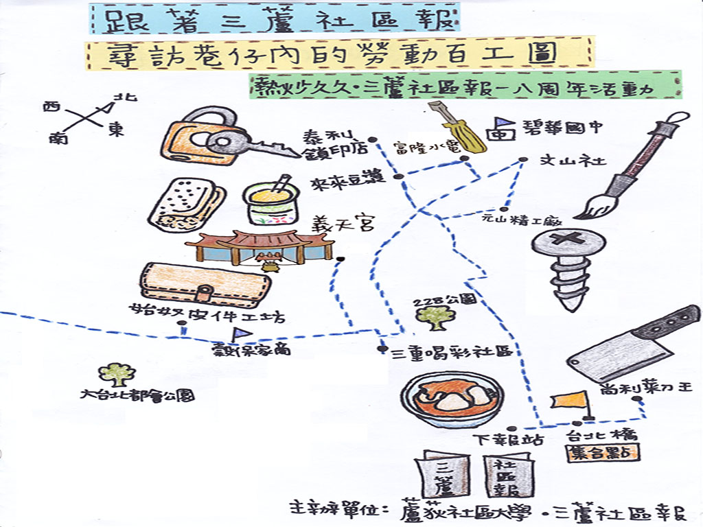 本次小旅行為「熱炒久久˙三蘆社區報」8周年活動,於2019年(民國108年)10月27日舉辦,走訪「熱炒久久˙三蘆社區報」的專欄-勞動百工圖的勞動職人,共走訪10個社區點、11個勞動故事,從:夜晚勞動者-派報生;生活必需品-刀具達人、鎖匙達人、水電達人;工業螺絲釘-車床;即將消失的中國文化-毛筆;天然手作職人好味道-素食早餐、肉圓;地方信仰-三重義天宮;大廈不可或缺的管理者-總幹事;現代勞動產業-青年網拍。