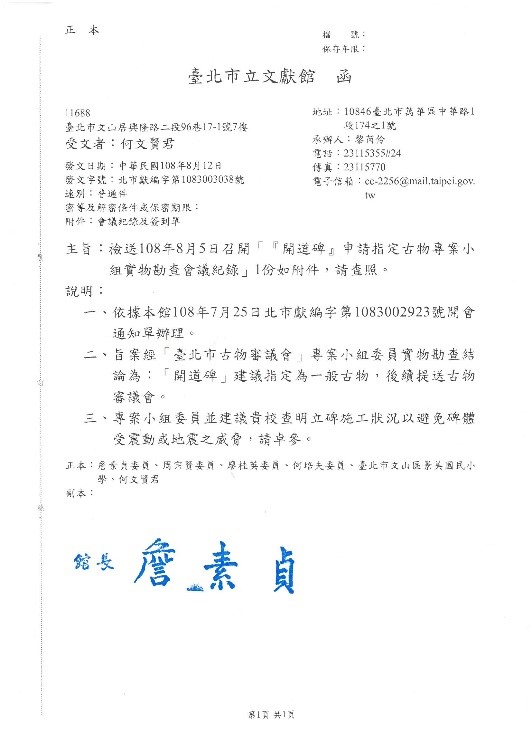 1908年設立於瑠公橋橋頭的開道碑,見證瑠公圳改道與景美開發史,文山學學程召集人何文賢老師特地向臺北市立文獻館提報申請認定,並於108年8月5日審議獲委員認可指定為古物,使「開道碑」能獲得良好保存及發揮教育意涵。