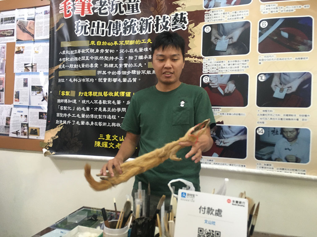 此照片為其中一站:三蘆社區報試刊1號勞動百工圖-文山社。文山社第三代傳人-陳冠豪,從小在父親-陳耀文製作毛筆湊去學習,耳濡目染中學會毛筆的製作,長大後到其他職場繞了一圈,決定回來繼承家業,希望可以把產業持續下去。