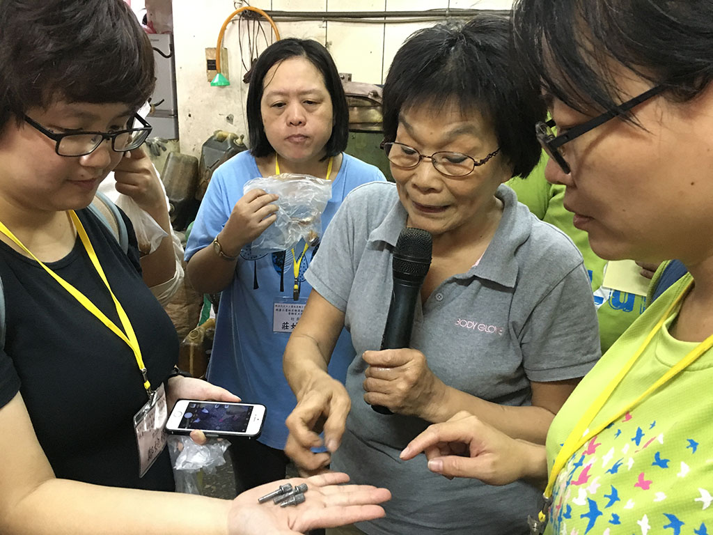 此照片為其中一站:三蘆社區報第42期勞動百工圖-元山精工廠,老闆娘詹玉鳳向參與者介紹車床,常見的螺絲上的螺旋狀、螺帽都是經過好幾道車床而來,是非常重要的經濟幕後推手。