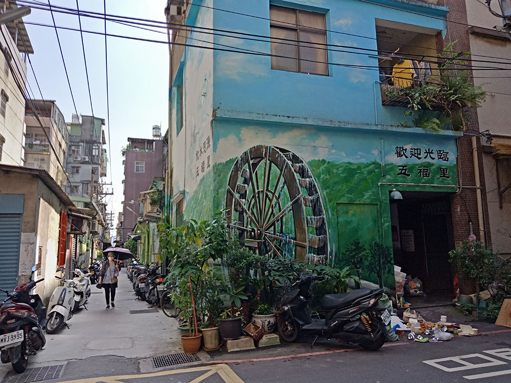 此照片為小旅行行徑三重區五福街附近巷弄,居住在這的社區報記者林志清說道:它是下水道的後巷,原本是陰暗髒亂,在五福里里長李福山協助整理下,牆面繪製古早農村生活彩繪,讓經過的人會忍不出拍照,也對這地方改觀。經過社區報記者的介紹,大家對在地歷史有更多認識與新發現。