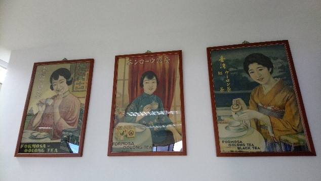 照片為目前懸掛在「台北市茶商業同業公會」的三幅在日本使用的臺灣茶海報,其中兩幅單獨標識烏龍茶,最右邊一幅標識烏龍茶與紅茶,海報中均以仕女悠閒喝台灣茶呈現台灣烏龍茶及紅茶意境。