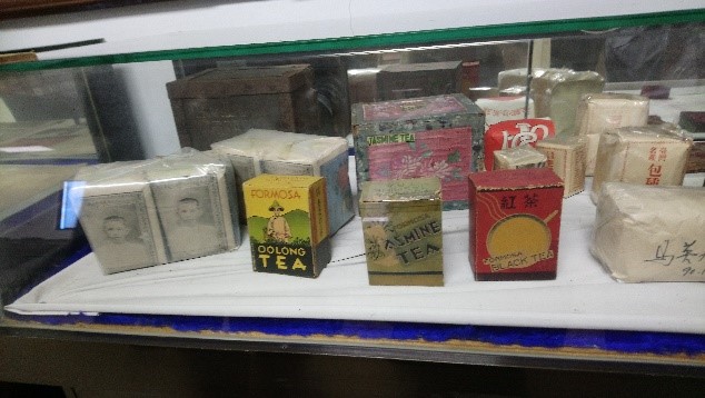 照片為「台北市茶商業同業公會」收集之會員內、外銷茶葉包裝。照片中廚櫃內保存之包裝,大致是銷往東南亞為主的茶葉包裝。包裝的樣式有盒裝,也有紙包裝,紙盒裝是烏龍茶,紅茶與茉莉花茶各有一件,紙包裝是包種茶與花茶。