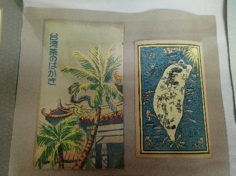 圖中的兩張明信片除左邊一張以日文文字標明「臺灣茶的明信片」之外,兩張明信片的圖形意象,並無法聯想到與茶葉有關。照片右側明信片為臺灣物產圖,左側明信片則為臺灣廟宇與代表熱帶風情的椰子樹。明信片中的圖為繪製圖,相當精美,可惜容易當作風景明信片使用。
