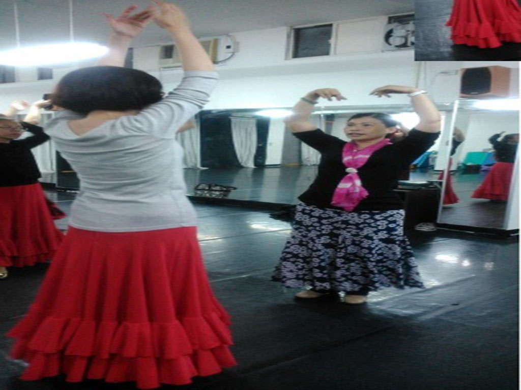 本照片攝於2013年(民國102年),經過遠征西班牙習舞變得自信美麗的麗華,在蘆荻社大正式成為佛朗明哥舞班老師,以自己紮實的學習歷程,帶領學員突破各階段面臨的關卡,從發展自己到發展他人,是蘆荻社大學員變講師的典範。