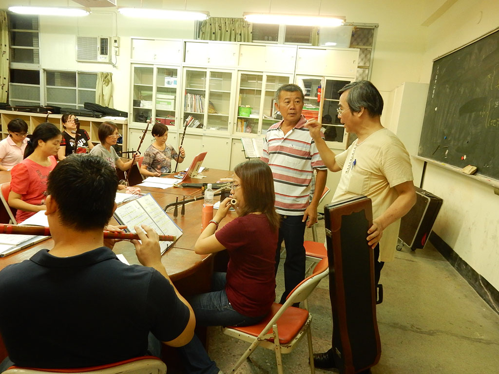 本照片攝於2016年(民國105年)蘆荻社大《國樂大家樂~竹笛、二胡、彈撥的進階與合奏》課堂,已經跟著王永老師學習十餘年的銘憲,是老師最依重的助理老師。另外銘憲也是蘆荻國樂隊-漫樂團的團長,不只凝聚內部,更帶領成員走出去義演,是蘆荻公共化學習,學員變講師的典範。