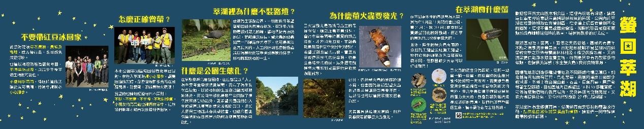 木柵公園萃湖為臺北市指定復育螢火蟲的三座都市公園的其中一座,復育螢火蟲的數量至2020年最豐。於106年起每年4月螢火蟲化蛹季成為臺北市工務局公園路燈管理處的重點推廣活動。為了民眾夜間賞螢的安全性及降低民眾參訪造成對生態的衝擊,於108年4月15日起由萃湖志工隊自主排班進行長達21天的夜間導護。夜間賞螢導護期間108年4月15日至5月5日晚間6點40分至8點,總參觀人次約4162人次,單日最高賞螢人數約為578人次,期間動用志工為185人次。基於107年的工作經驗,因參訪民眾過多,現場志工只能進行秩序管制及勸導民眾賞螢守則,無法在區域內進行導覽解說或環境教育。因此導護期間亦於公園加設大型解說帆布及播放復育行動的活動記錄片,並配置一名志工在旁進行短講解說,以期擴大環的面向及受眾。公園生態化並非一朝一夕能夠達成,未來也將以理念推廣與經營民眾有感的環境教育活動為指標。萃湖所處的木柵公園是文山社大創校時期即發展而成的共學基地,萃湖也成為社大師生寫生、攝影、生態走讀的重要場所。文山社大於101年開始為木柵公園更新規劃辦理願景工作坊,居民反應熱烈,隨後即開始培訓志工,並於105年正式認養萃湖的復育工作。