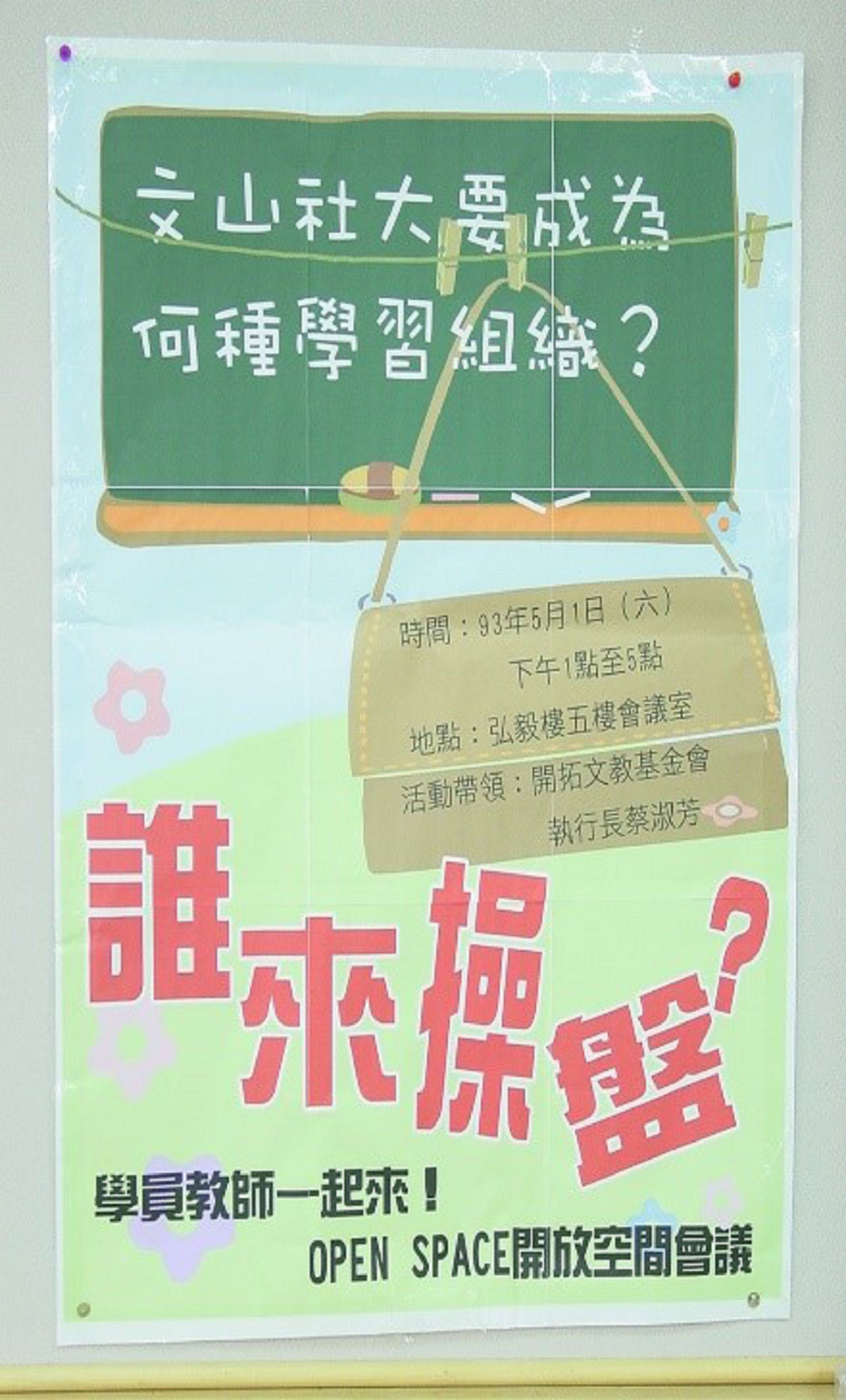 2003年11月7日,台北市文山社區大學迎接辦學五周年慶,邀請開放空間會議(Open Space Technology)引導師蔡淑芳,於校務會議帶領校務代表及顧問們,形成「什麼是社大最重要的事」的共識。