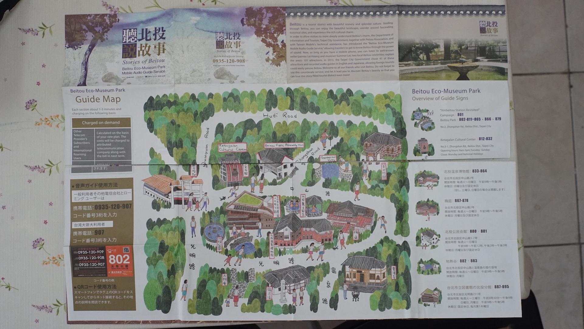 「聽北投說故事」是八頭里仁協會與台灣大哥大合作的語音導覽計畫,由公部門、台灣大哥大、八頭里仁協會三方協力,開張於2012年10月17日。總共在北投公園內設置101個導覽點,地點包含梅庭、北投公園會館、地熱谷、草山行館等,民眾可自行掃描QR code聆聽導覽,共有中英日三種語言,透過電信業者以秒計算收費。