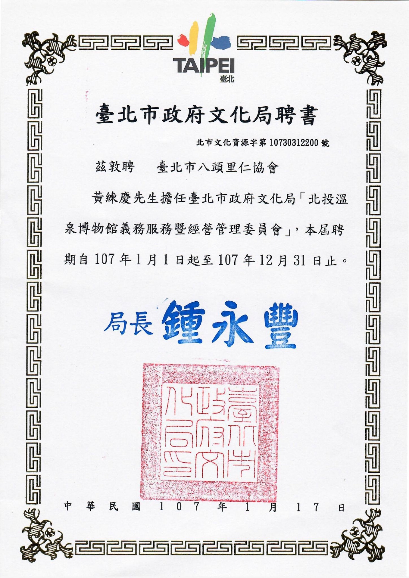 該委員會成員共十五人,其中需包含社區代表九人,而台北市八頭里仁協會身為長期推動地方鄉土人文事務的重要角色,也長期投入該委員會中,以每屆的理事長為代表,出席委員會的各項會議,提供社區視角實際的需求與建言。