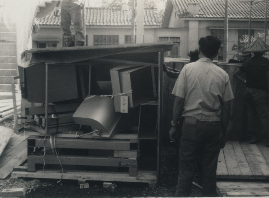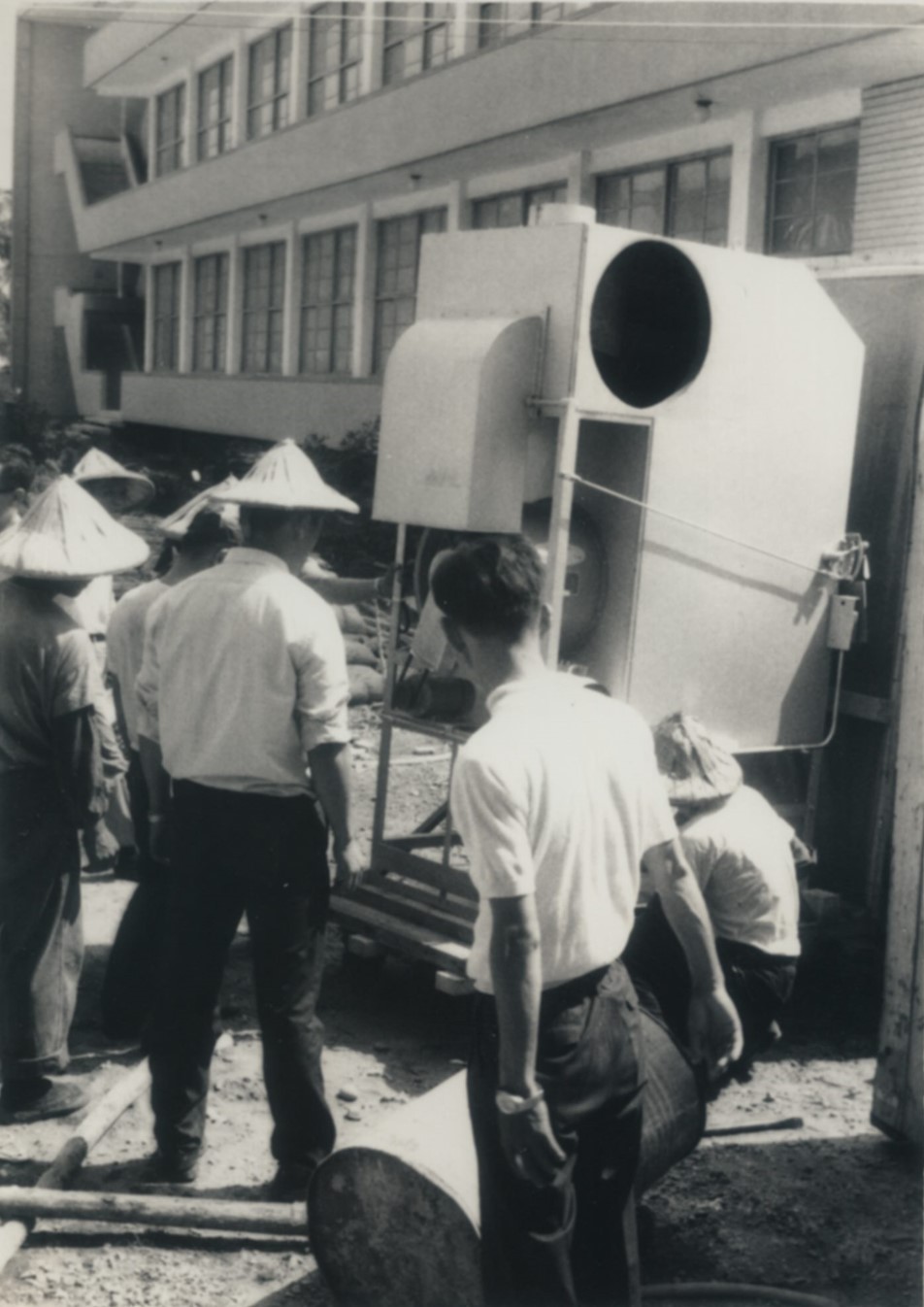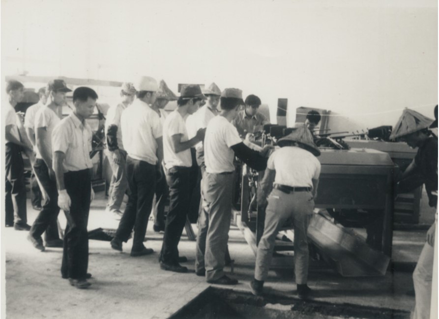 圖為1972年(民國61年)茶業改良場引進最新60kg型自動一貫作業煎茶生產線一組的裝配作業之情景。