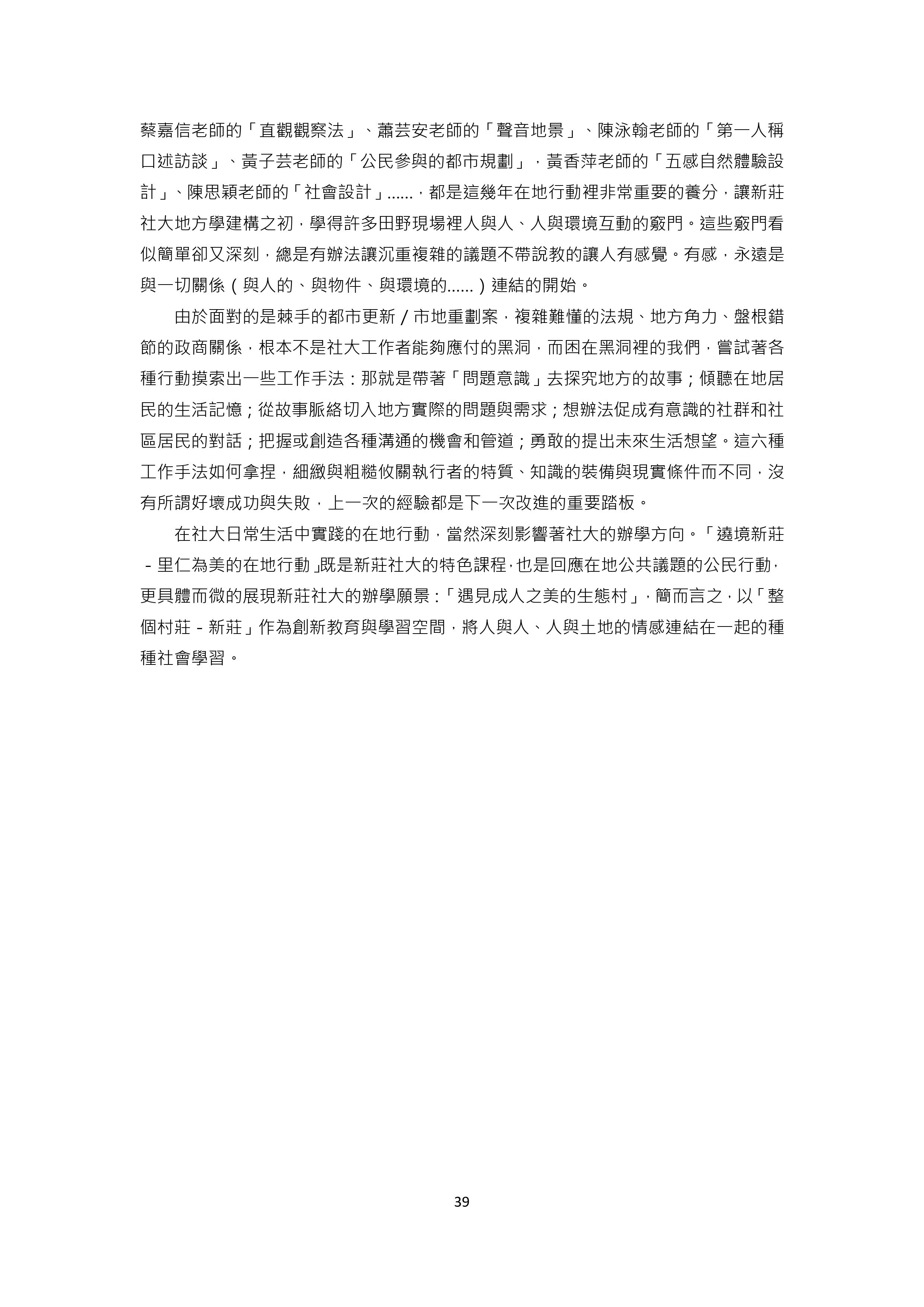 從2017到2018,連續兩年的時間,社區大學全國促進會與新莊社區大學合作執行「社區大學師工學協力治校探討與實踐」計畫,新莊社大參與計畫的方案主要是藉由形式多樣的「文本共寫」來深化工作人員與其正參與發展的學習社群之間的協作關係。在第二年計畫中,新莊嘗試系統性的爬梳兩個案例經驗—「散步節四年回顧」與「2018年秋季公民論壇週社大人之夜的籌備過程」,來作答「新莊社大如何實踐師工學協力治校?」
