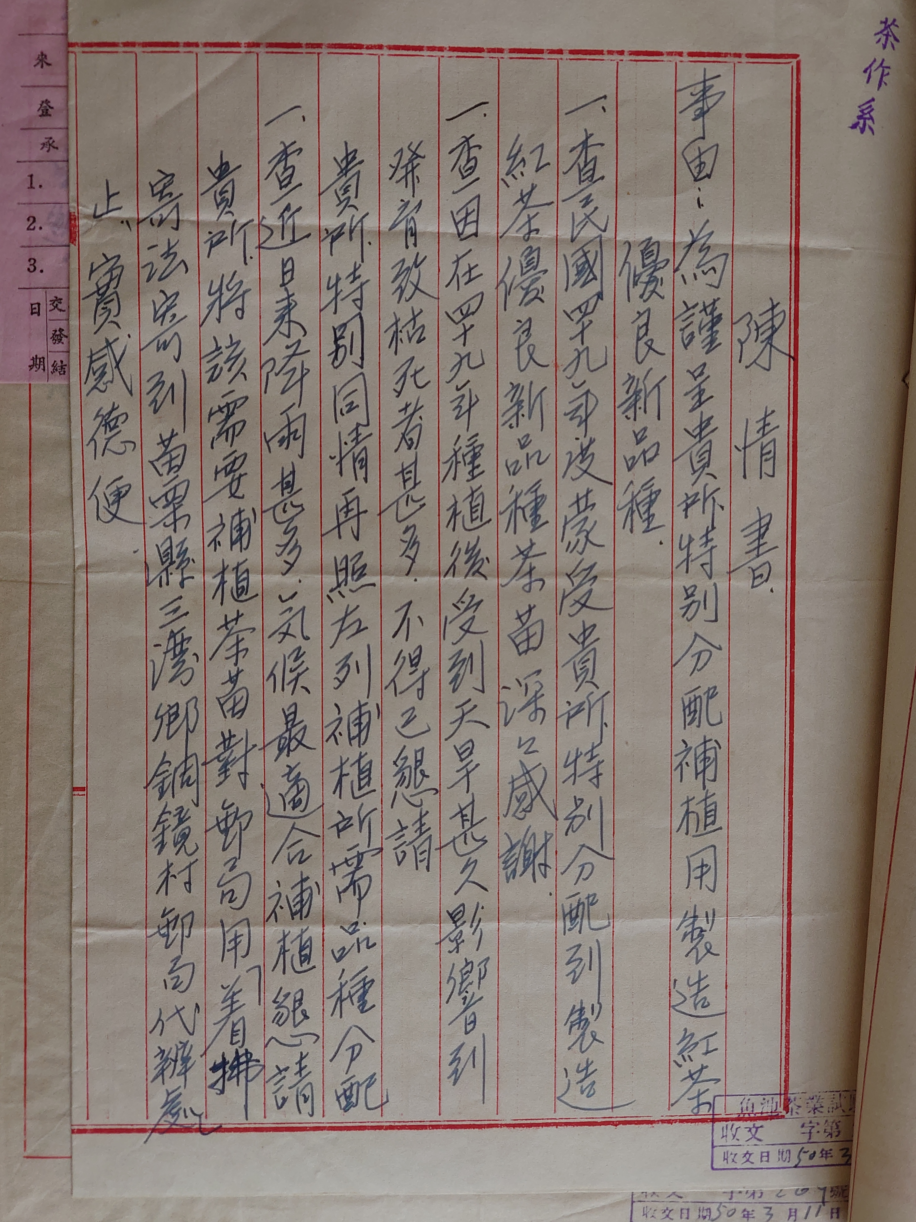 照片為1960年(民國49年)魚池茶業試驗分所分配適製紅茶的新品種(系)茶苗予苗栗縣三灣鄉銅鏡村民間人士辦理新品種試作,然而當年度因乾旱日數甚久導致新植茶苗枯死不少,至民國50年陳情書作者在不得已的情況下商請魚池茶業試驗分所再次提供新品種茶苗補植,並於文末詳列各品種(系)所需茶苗之株數,為當時品系代號303、5118、404及FKK1(臺茶21號之母本)等於苗栗三灣試種之紀錄。1961年(民國50年)時魚池分所雖同意提供茶苗,但培育之茶苗尚未成長至可用,因此魚池分所決定於次一年度依陳情書辦理補植。