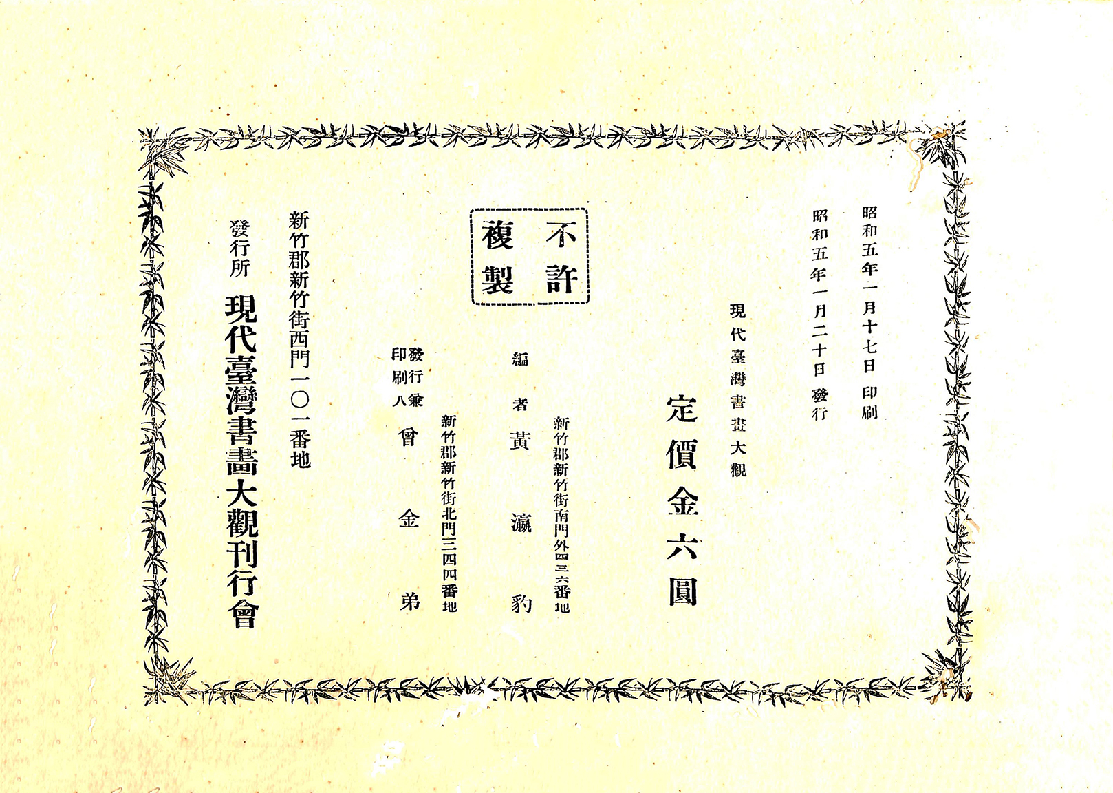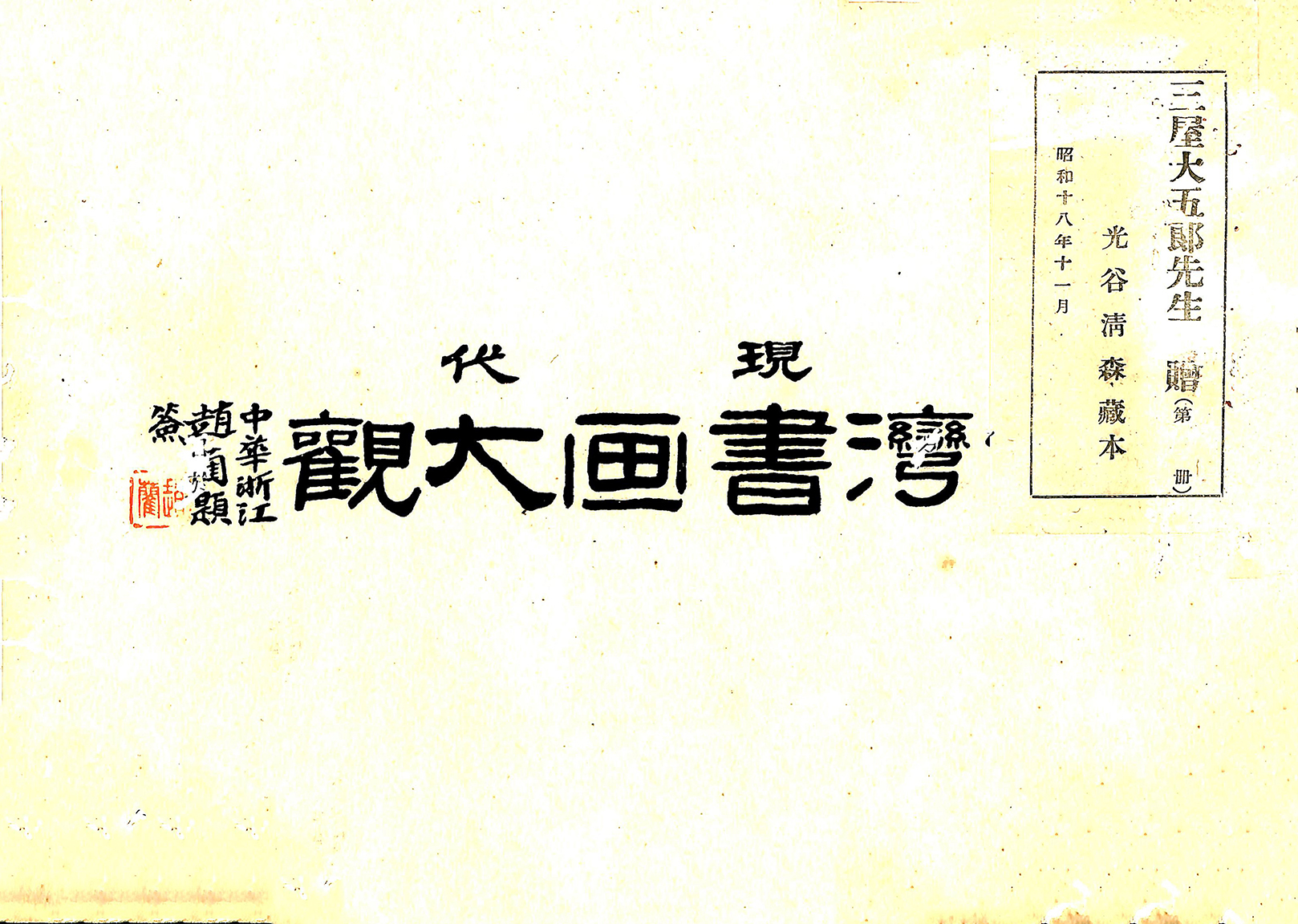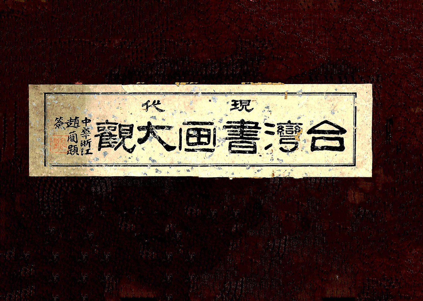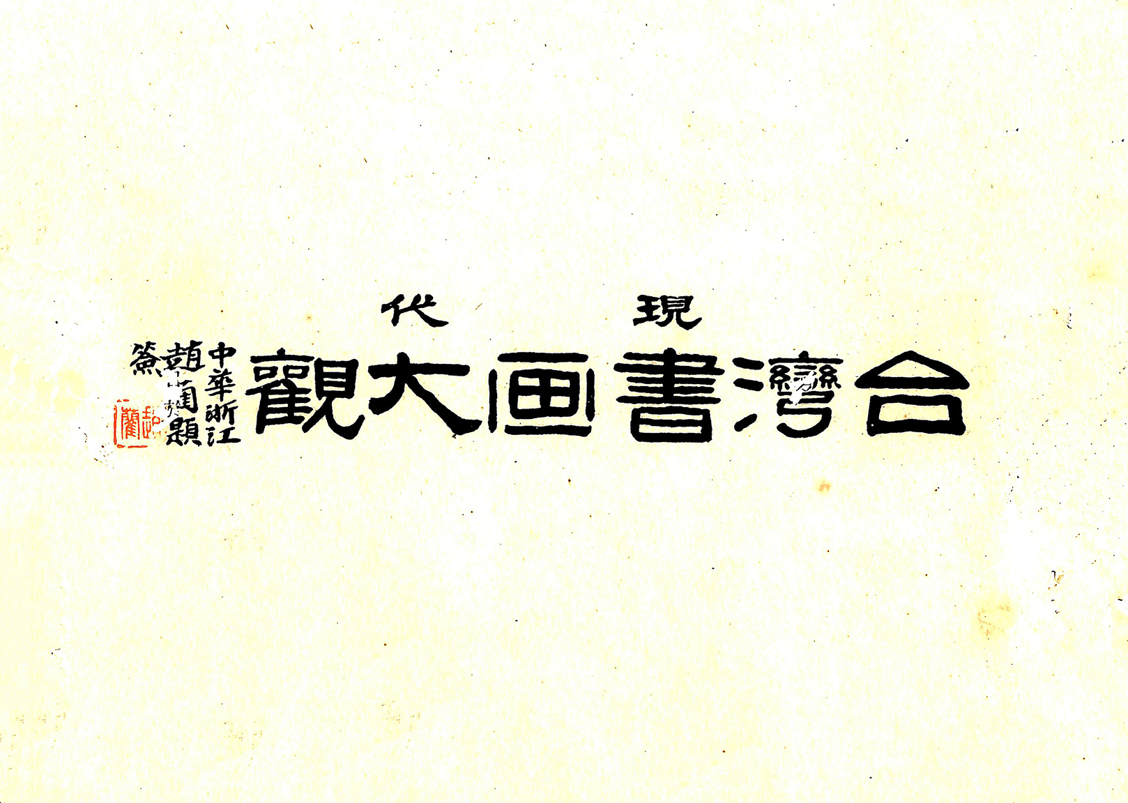 《現代臺灣書畫大觀》,黃瀛豹編著,1930年(昭和5年)1月,現代臺灣書画大觀刊行會發行,發行人曾金弟。本書為橫式右翻,封面正中題簽「現代臺灣書画大觀」、「中華浙江趙藺題簽」,內頁為1920年代臺灣書畫家的作品暨簡介,各書畫家的編目、次序並非按照得獎名次,而是以版面美觀為主要考量。在作品圖錄之外附上書畫家小傳的作法,使得此本書畫圖錄成為了解日治時期臺灣傳統書畫家風格的重要參考資料。