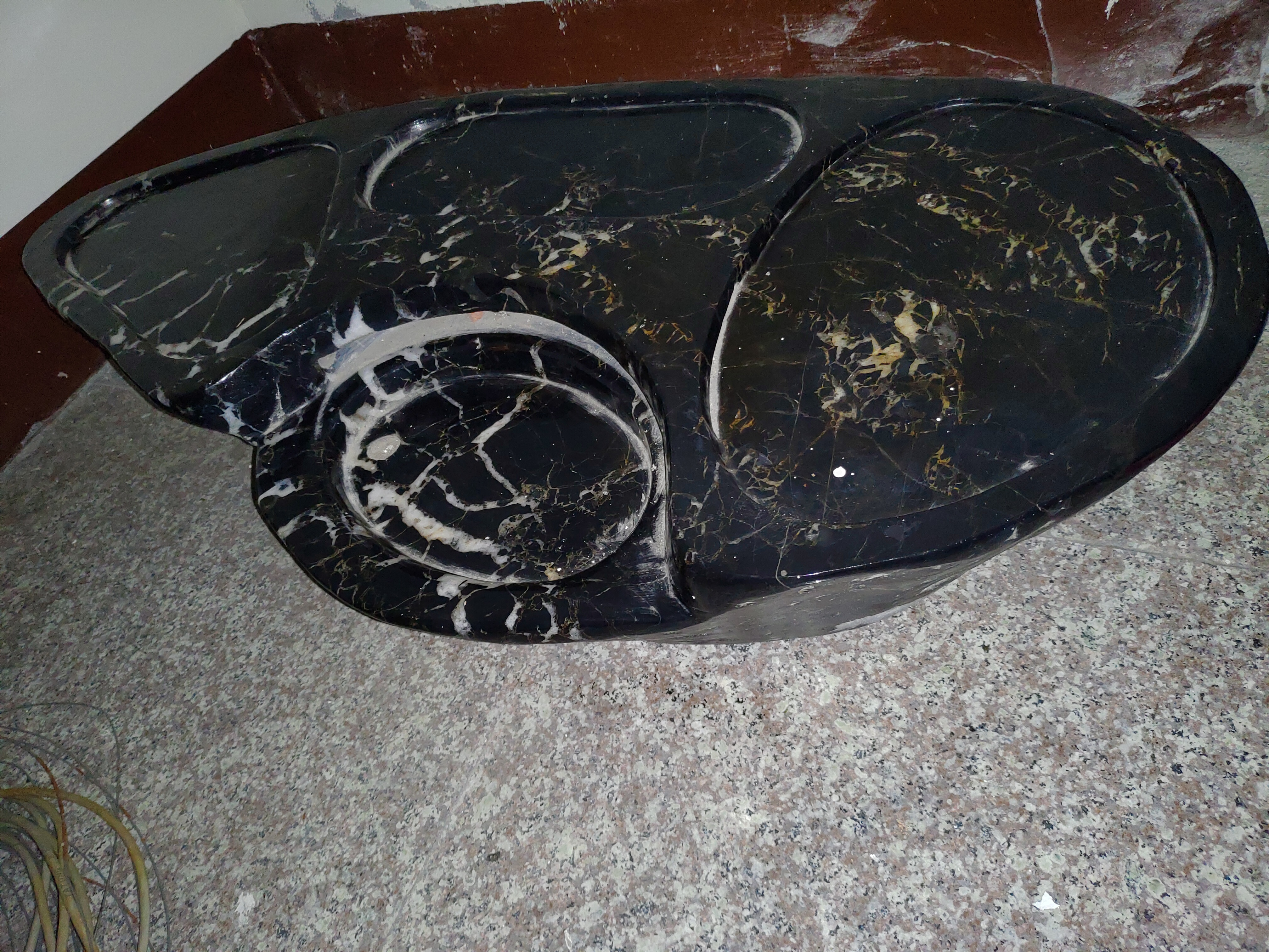用來製作茶盤的材質有很多種,常見的有竹製、木製、原木或不鏽鋼等,另外,也有較少人使用,用石頭磨製而成的「石茶盤」。照片中的石茶盤為取自南投縣埔里鎮眉溪的黑膽石所磨製而成二層式「黑膽石茶盤」。