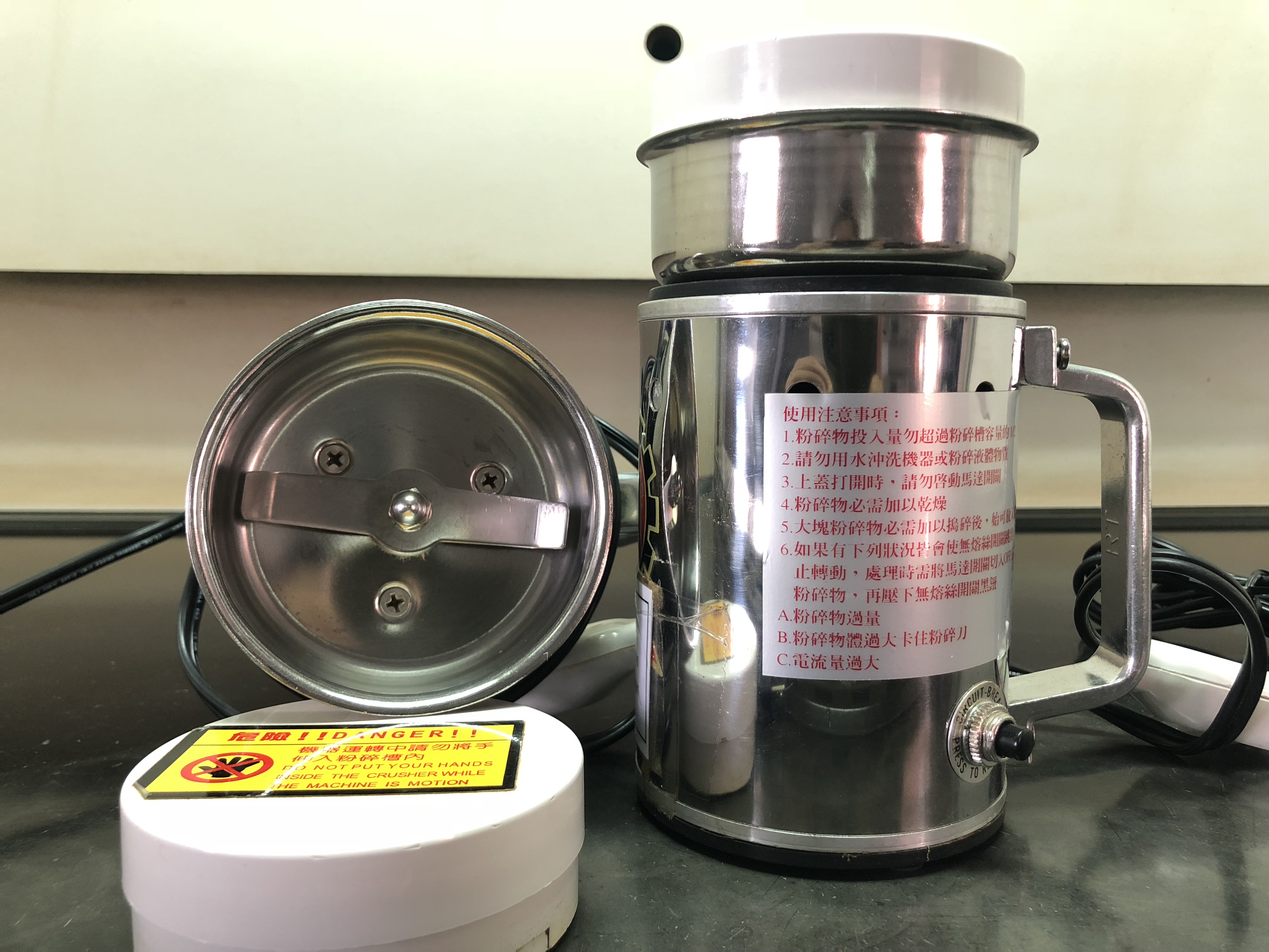 茶業改良場農業藥物檢驗中心主要負責茶葉農藥殘留檢驗,參考衛生福利部公告檢驗方法「食品中殘留農藥檢驗方法-多重殘留分析方法(五)」進行樣品分析,其中樣品前處理需先將茶葉樣品磨製成粉狀,粉碎機即為粉碎樣品之主要機具。