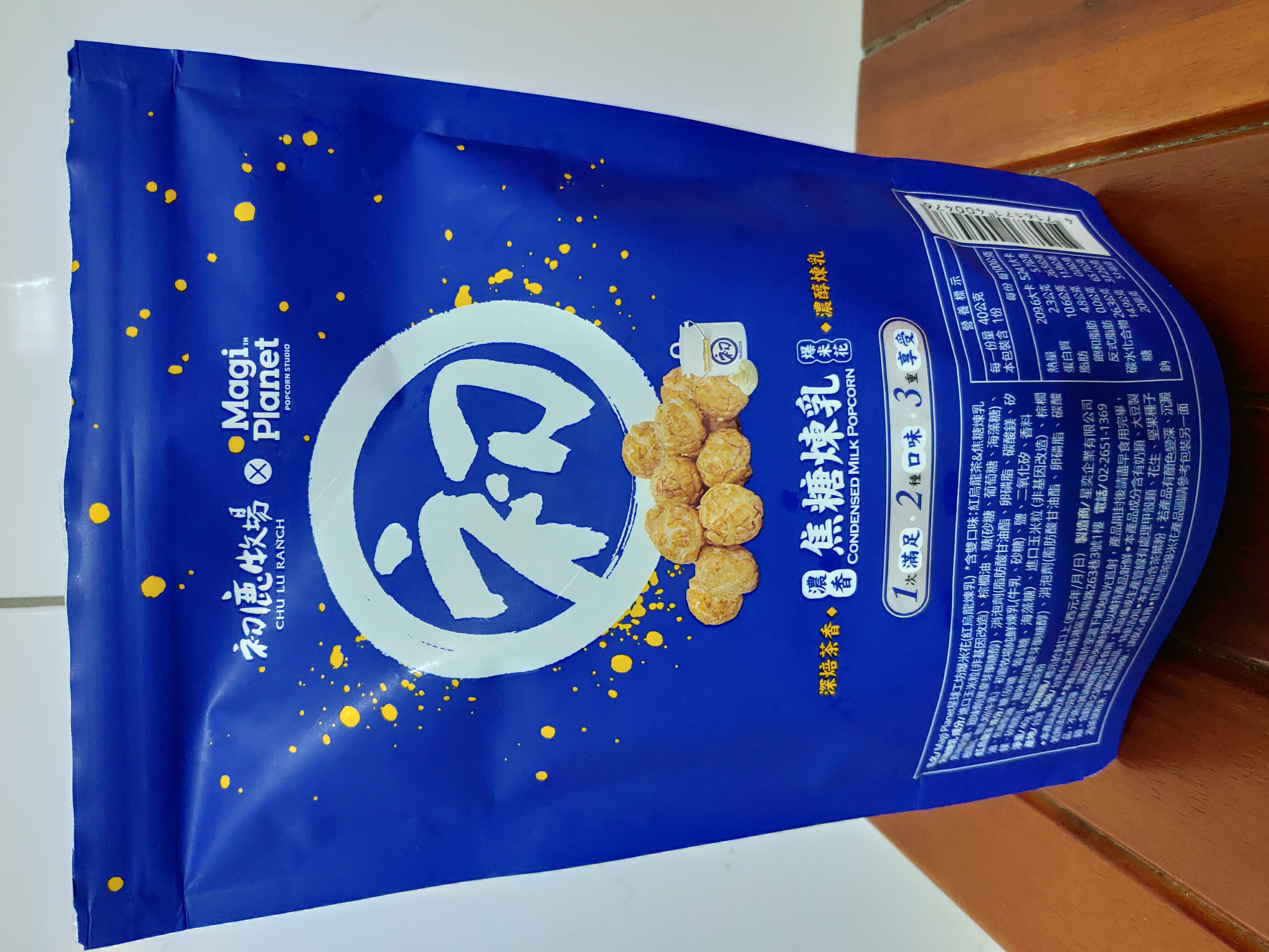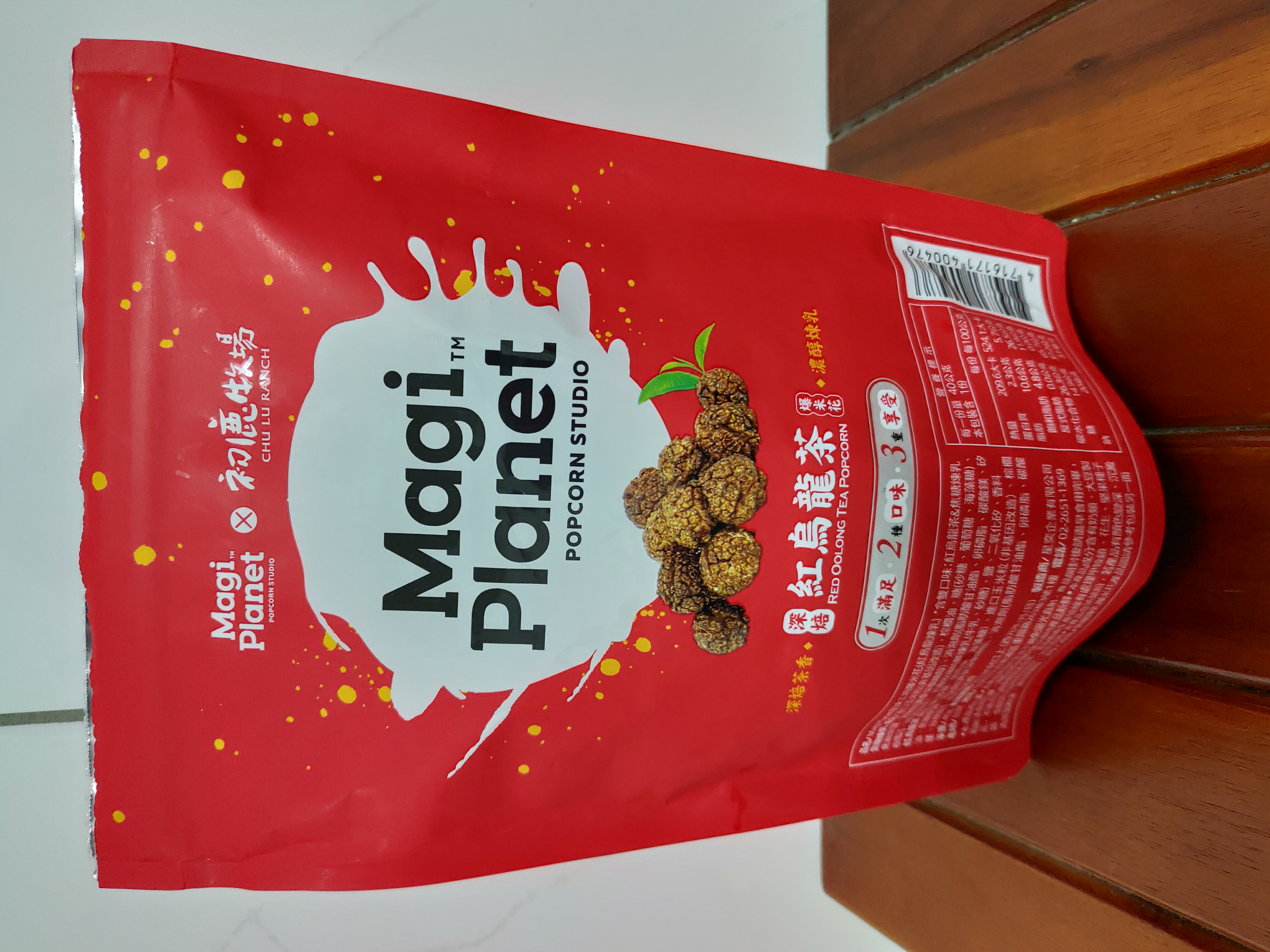 照片中的產品是茶多元化產品-「紅烏龍茶爆米花」,是同一包內具有兩種不同風味的爆米花,以臺灣東部紅烏龍茶粉為原料,添加於爆米花中,並於同一包產品混合搭配焦糖煉乳風味的爆米花。