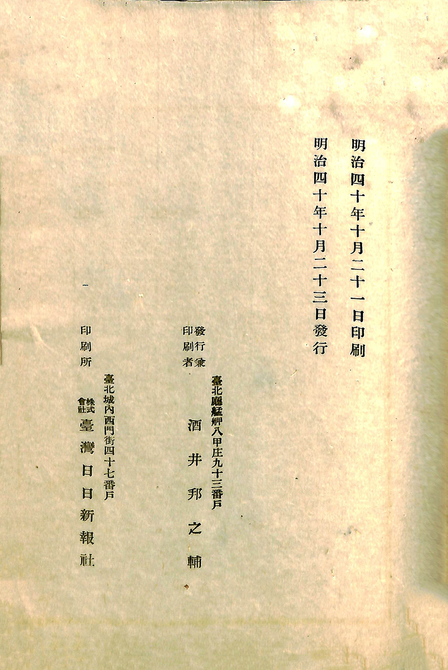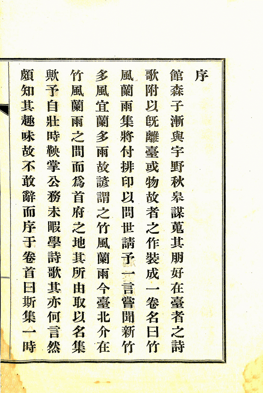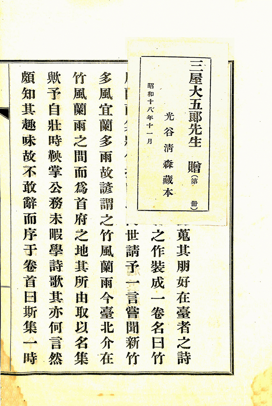 《竹風蘭雨集》,線裝書,直式右翻,鉛印本,館森鴻(子漸)、宇野秋皋(覺太郎)編纂,1907年(明治40年)酒井邦之輔發行、株式會社臺灣日日新報印刷。