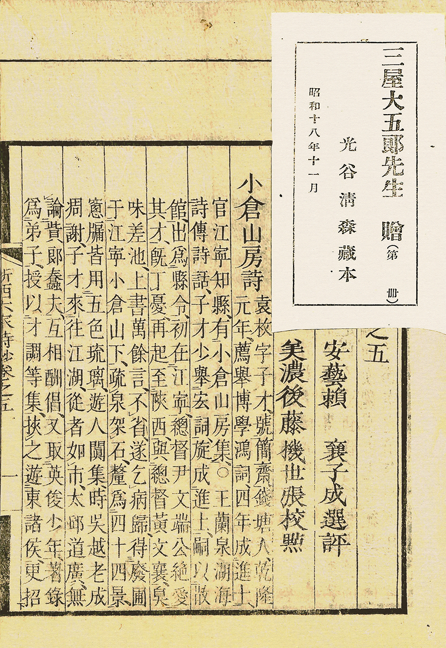 卷五袁枚《小倉山房詩》,卷首有作者簡介與王蘭泉(昶)、吳應和評語,王評「才華既盛,信手拈來,矜新鬪捷,不必盡遵軌範,且清靈雋妙,筆舌互用,能解人意中蘊結。」認為袁枚有文才,作詩求新求變,雖不盡遵詩作法度,但清新、雋永,亦雜口語,能解人心中的鬱結之氣。此評正符合袁枚所屬的「性靈派」意象。但賴山陽對袁枚的評價不高,頁眉的評語諸如「子才(袁枚)長篇,皆弄狡獪,欺凡目者。」「是所謂狡獪者,何必取之。」雖亦有正評「此等詩,不愧古人,不如此,何以稱子才哉。」但就如本套書筱崎弼〈序〉大多講述賴山陽對袁枚的評價,「山陽評清人詩文,有抑有揚,至於隨園,則抑之殊甚。……山陽以為子才實子才,然亦太傲慢,因索其瑕疵,指擿不遺,使隨園不得專擅藝圃。」賴山陽有種批露袁枚詩作過失,使其不致在文壇稱霸之意,蓋「性靈」之詩,才高者揮灑自如,末流者落於淺薄與詩人的無病呻吟,利弊相隨。