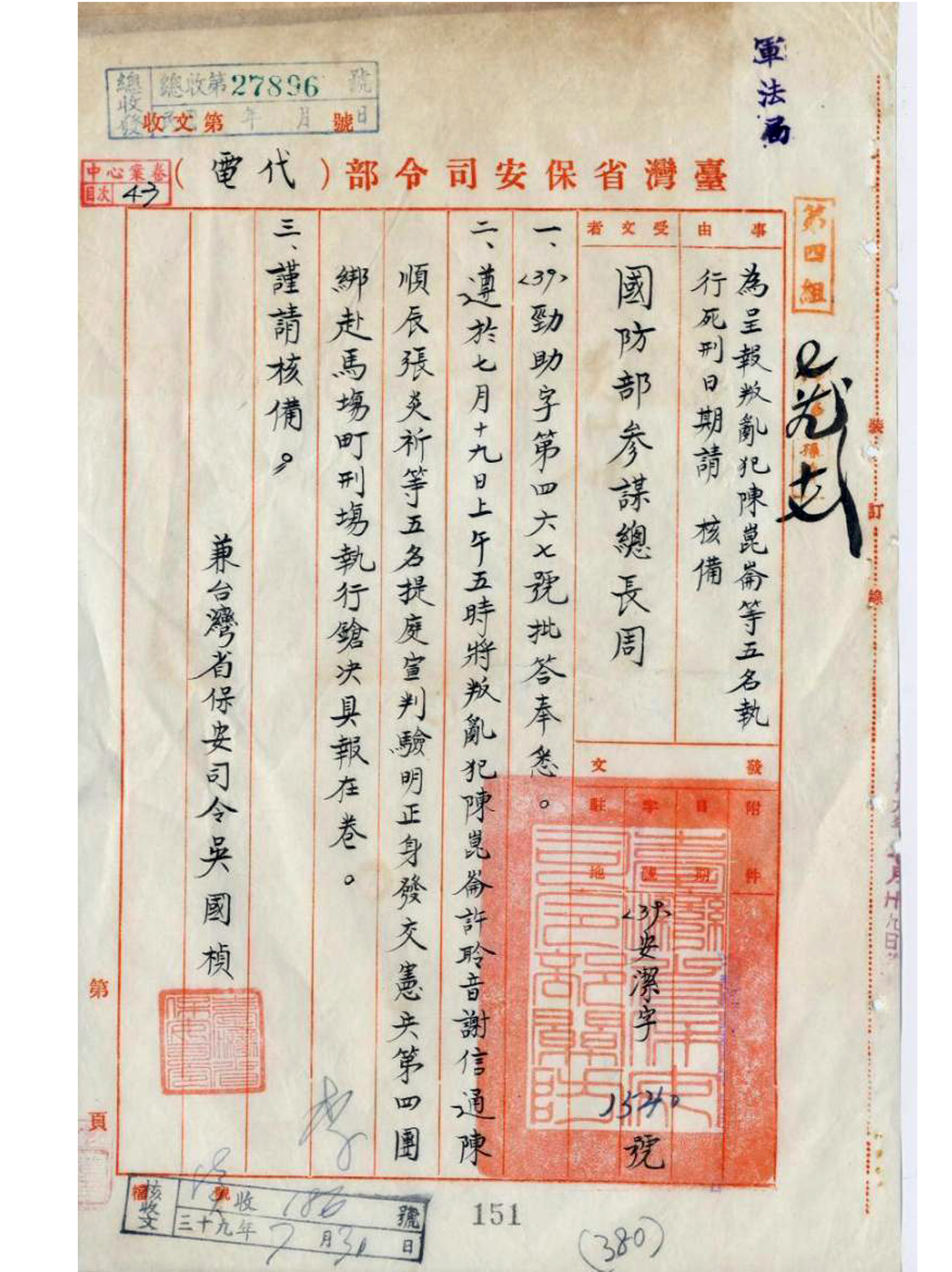 1950年7月30日,台灣省保安司令部以代電向時任國防部參謀總長的周至柔呈報「叛亂犯陳崑崙等五名執行死刑日期」,內容稱「七月十九日上午五時,將叛亂犯陳崑崙、許聆音、謝信通、陳順辰、張炎祈等五名提庭宣判驗明正身發交憲兵第四團綁赴馬場町執行槍決具報在卷。」