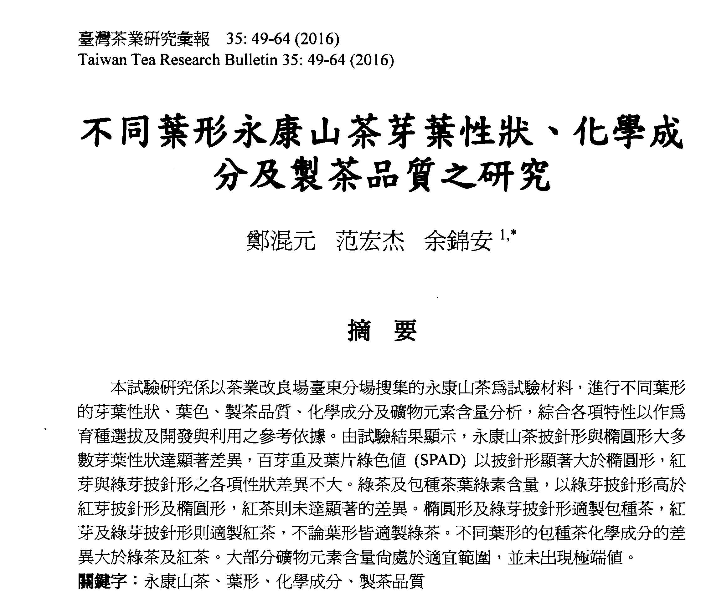 圖為2016年(民國105年)刊載於茶業研究彙報35卷,由鄭混元、范宏傑、余錦安發表的「不同葉形永康山茶芽葉性狀、化學成分及製茶品質之研究」論文。