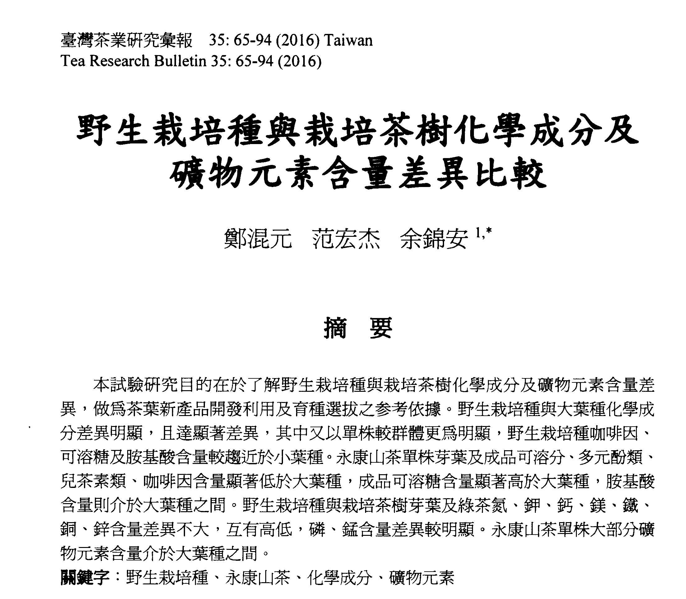 圖為2016年(民國105年)刊載於茶業研究彙報35卷,由鄭混元、范宏傑、余錦安發表的「野生栽培種與栽培茶樹化學成分及礦物元素含量差異比較」論文。