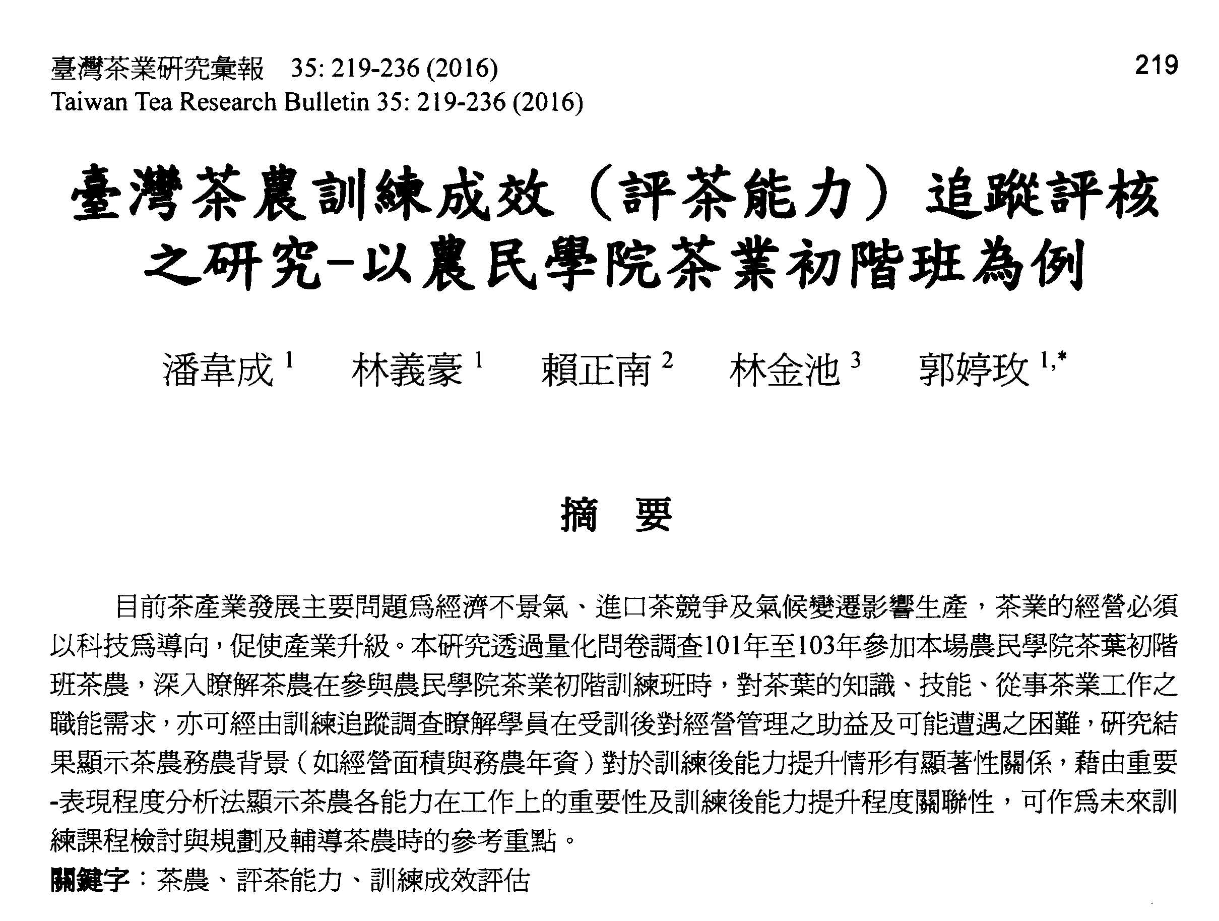 圖為2016年(民國105年)刊載於茶業研究彙報35卷,由潘韋成等五位研究人員發表的「臺灣茶農訓練成效(評茶能力)追蹤評核之研究-以農民學院茶業初階班為例」論文。