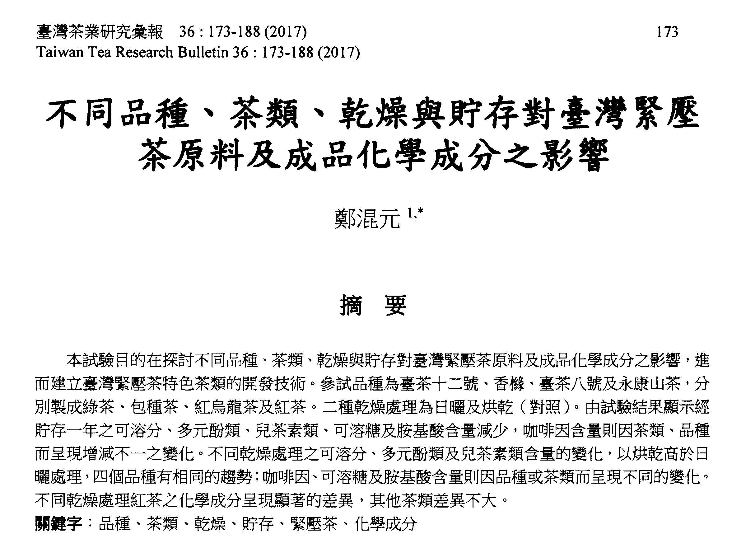 圖為2017年(民國106年)刊載於茶業研究彙報36卷,由鄭混元撰寫的「不同品種、茶類、乾燥與貯存對臺灣緊壓茶原料及成品化學成分之影響」論文。