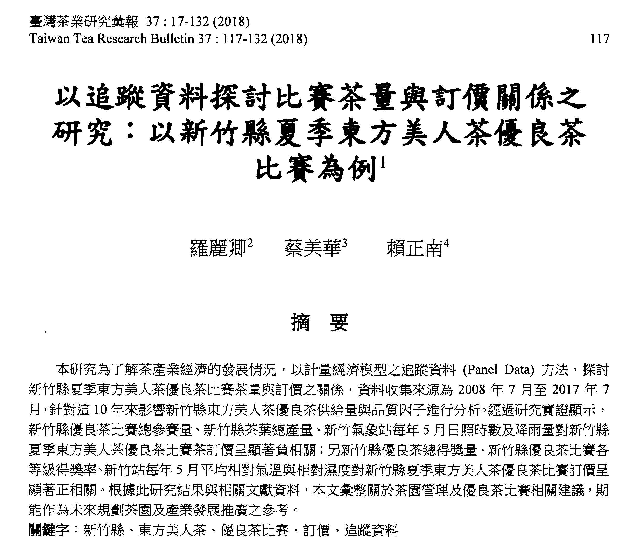 圖為2018年(民國,107年)刊載於茶業研究彙報37卷,由羅麗卿、蔡美華與賴正南撰寫的「計量經濟模型之追蹤資料 (Panel Data) 方法,探討新竹縣夏季東方美人茶優良茶比賽茶量與訂價之關係」論文。