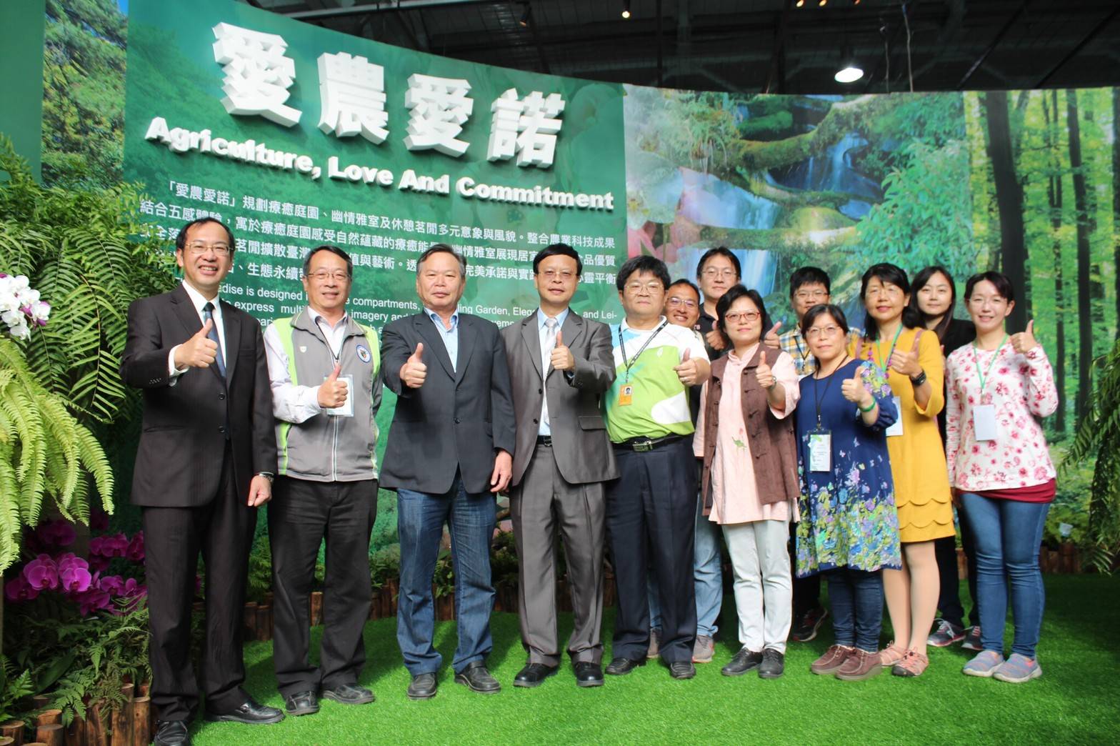 本照片為2019年(民國108年)3月2日於臺中世界花卉博覽會活動,位在外埔園區之智農館所舉辦的第三個展期-愛農愛諾開展時,各級長官與全體相關工作人員之合照。
