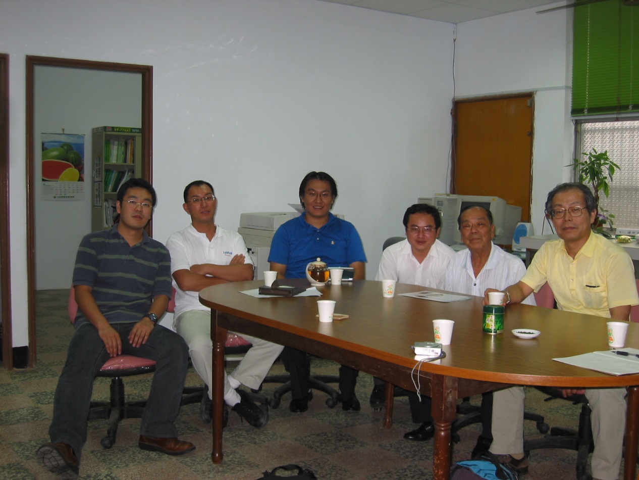 本照片為2003年(民國92年)日本京都大學坂田完三教授一行人,造訪茶業改良場;商談試驗合作事宜時拍攝之照片。照片人物由右至作為坂田教授、徐英祥研究員、蔡憲宗助理研究員、陳俊良助理研究員、水谷准教授、清水助教授。