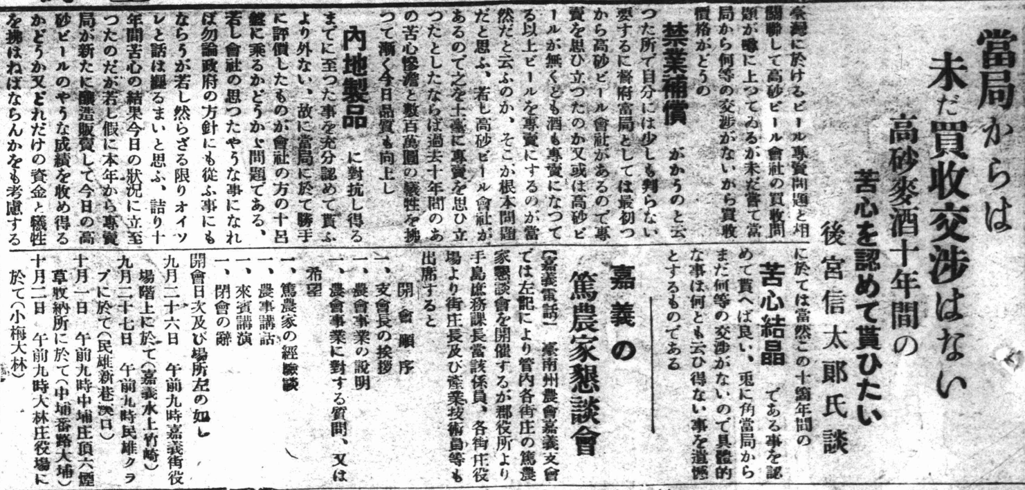1928年9月高砂麥酒社長後宮信太郎在《臺灣日日新報》上發表評論,強調高砂麥酒「過去十年來苦心慘澹經營所付出的犧牲,現在品質也逐步提升,甚至被認同足以與(日本)內地產品抗衡。」暗示專賣局如要收購高砂麥酒會社,應該要將高砂麥酒自1919年成立以來所投入的各項成本與犧牲都納入考量,提高收購價錢。