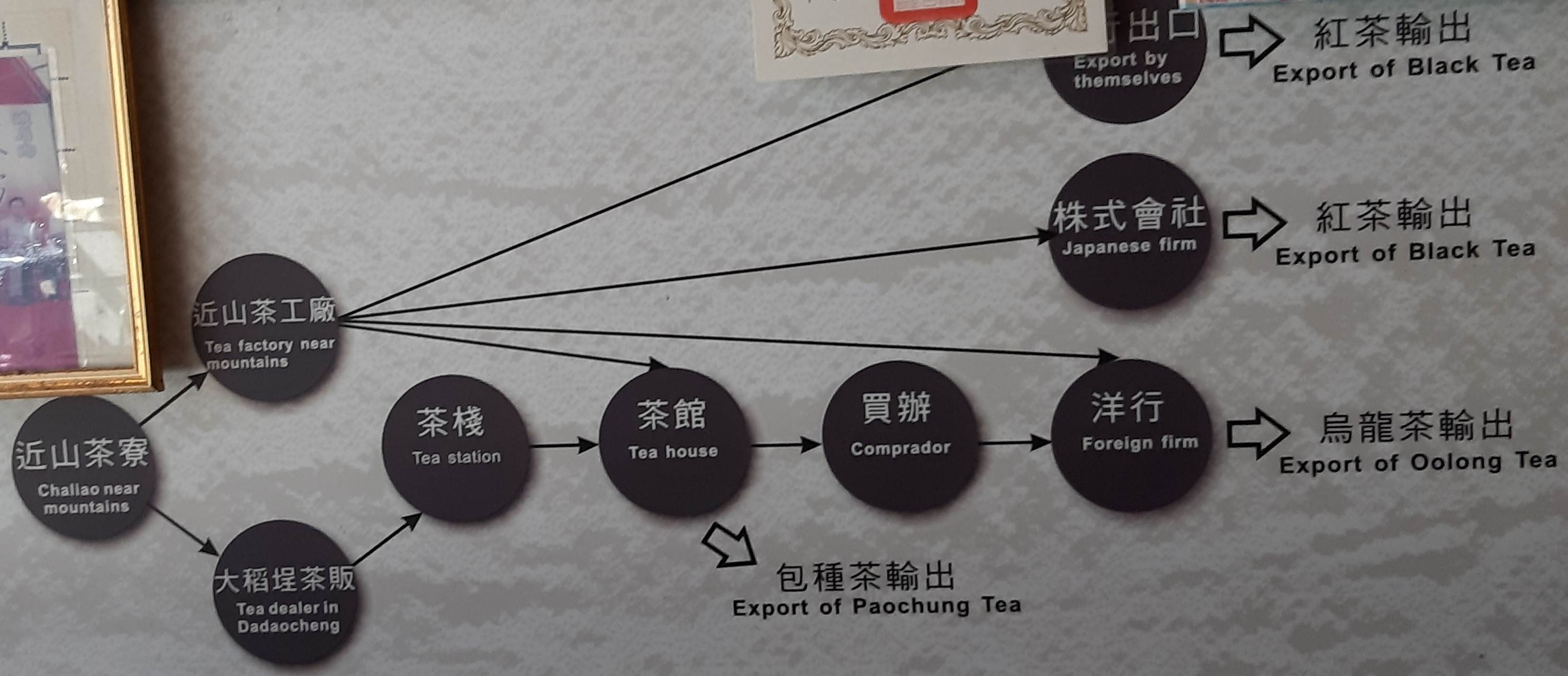 圖為日治後期桃竹近山地區粗製茶主要交易方式圖,拍攝於新竹縣峨眉鄉富興茶業文化館(前身是富興製茶工廠),富興製茶工廠是日治時代由富興村曾姓家族所興建(民國33年),2006年(民國95年)被文化局登錄為歷史建築,於2011年(民國100年)修建完成,致力於辦理導覽體驗及各類茶葉推廣活動。
