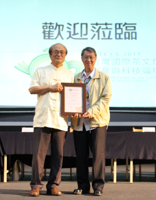 圖為時任行政院農業委員會茶業改良場陳國任場長(左),頒發感謝狀給前場長阮逸明博士(右)的合影,拍攝於「2015年臺灣國際茶文化創意與科技論壇International Forum on Tea Culture, Creativity & Science TAIWAN 2015 (簡稱IFTCCS) 」。該論壇由行政院農業委員會茶業改良場、國立臺灣工藝研究發展中心與南投縣政府於2015年(民國104年)10月8至9日假南投草屯青年活動中心辦理。