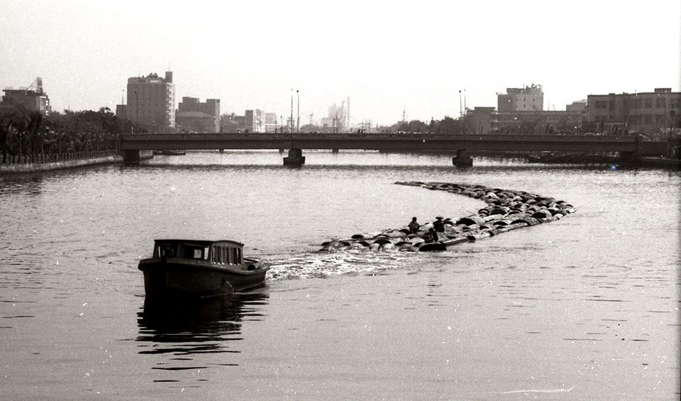 因木頭笨重,運用人工搬運費時又費工,工廠便利用水的浮力原理,以拖船拖運的方式減輕搬運的力氣。當時從國外運來的木頭,都會在卸在高雄港的港口,浸泡數天後,將木頭一塊一塊勾拖木船後方,一路從港口經由愛河,拖至工廠。本照片即具體顯示當時以拖船將木材從高雄港,行經愛河拖運至中都一帶合板工廠的作業風景。