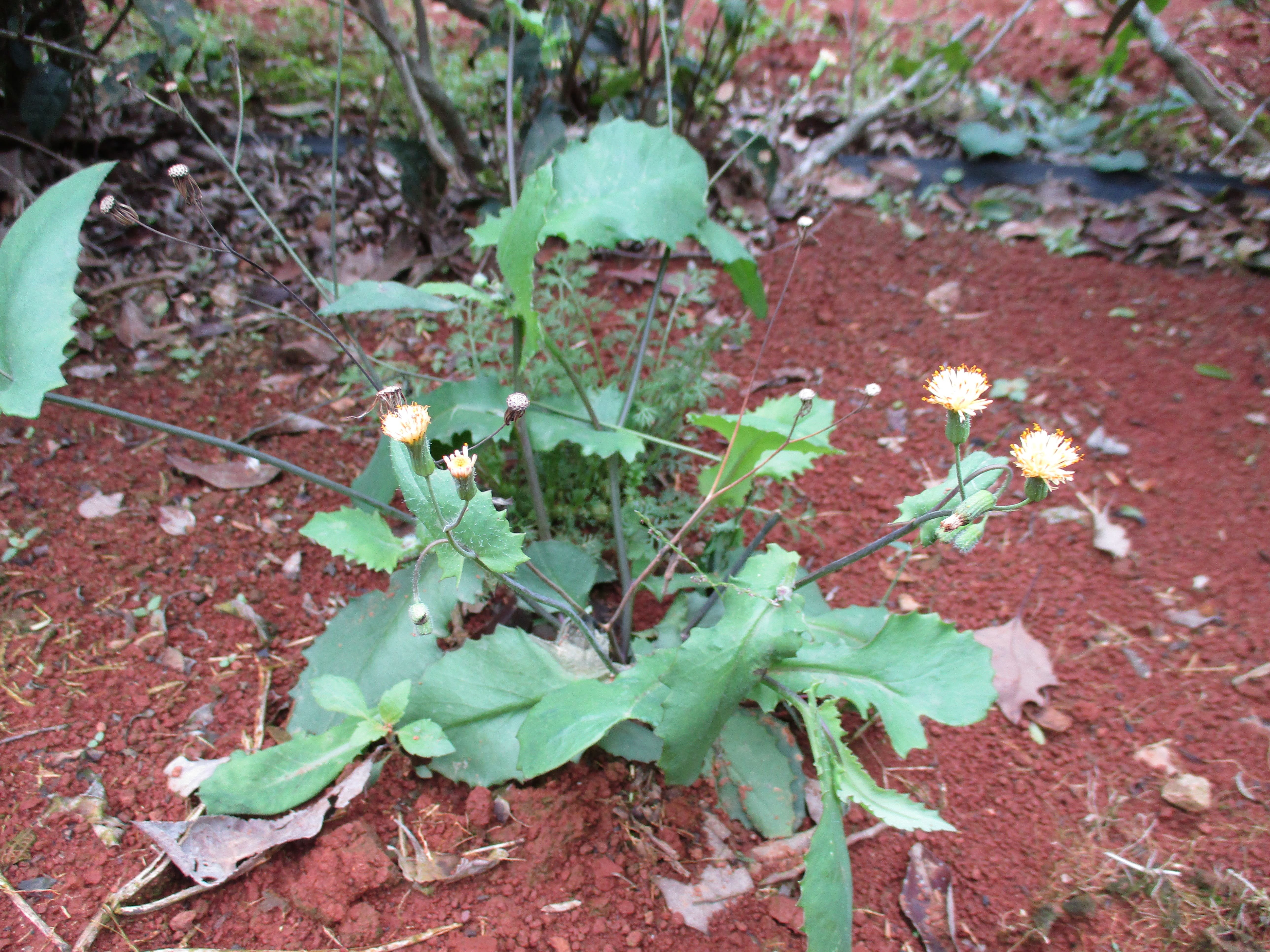 粉黃纓絨花,學名Emilia praetermissa,俗名纓絨花,纓絨菊、紅背草、流蘇花、一點纓、牛石花等,為菊科 (Compositae )紫背草屬(Emilia)一年生草本植物,一年四季皆可見。本照片為茶樹行間粉黃纓絨花盛花後期之植株狀況。