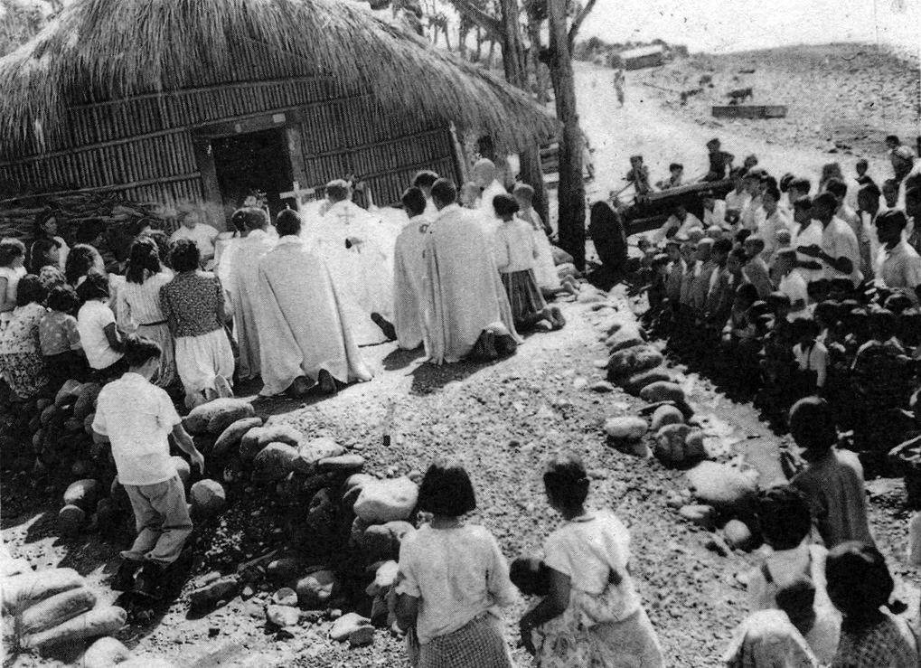 1954年3月,姚秉彝神父(Rev. Jorrit de Boer, SMB)與陳香雄傳教員將天主教傳入宜灣。照片呈現1950年代宜灣天主堂聖體遊行時,神父、傳教員和當地住民,在以竹子、茅草搭建的臨時祭臺舉行彌撒時的情景。