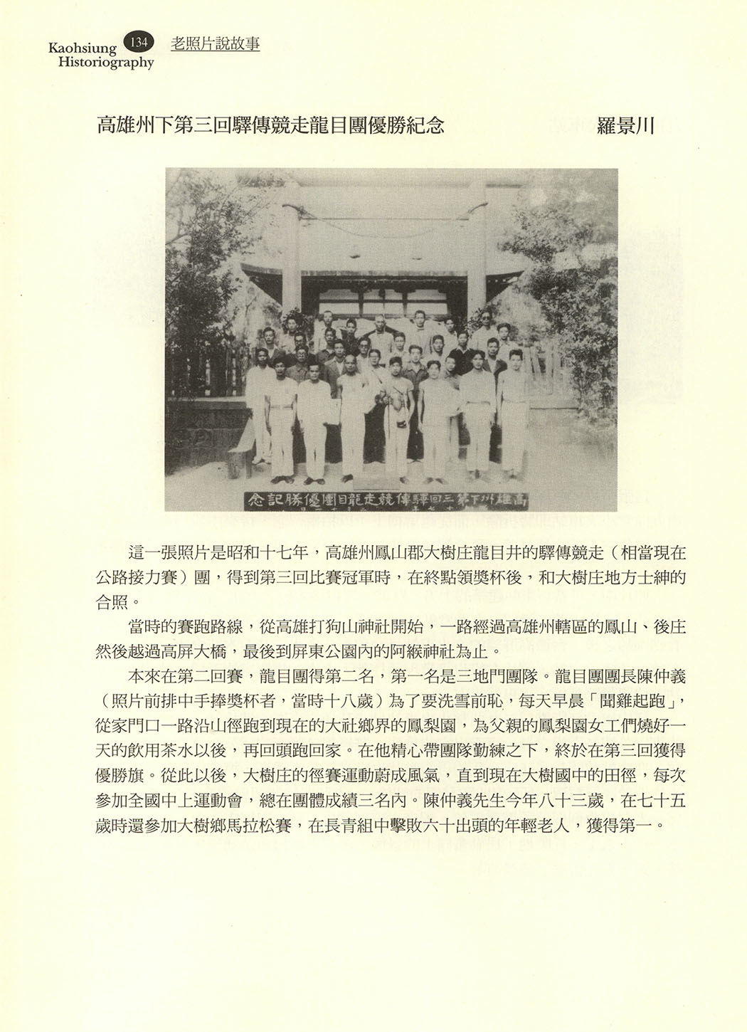 本文從1942年高雄州鳳山郡大樹庄龍目井的驛傳競走團優勝紀念的老照片開始說起,講述當時的歷史。