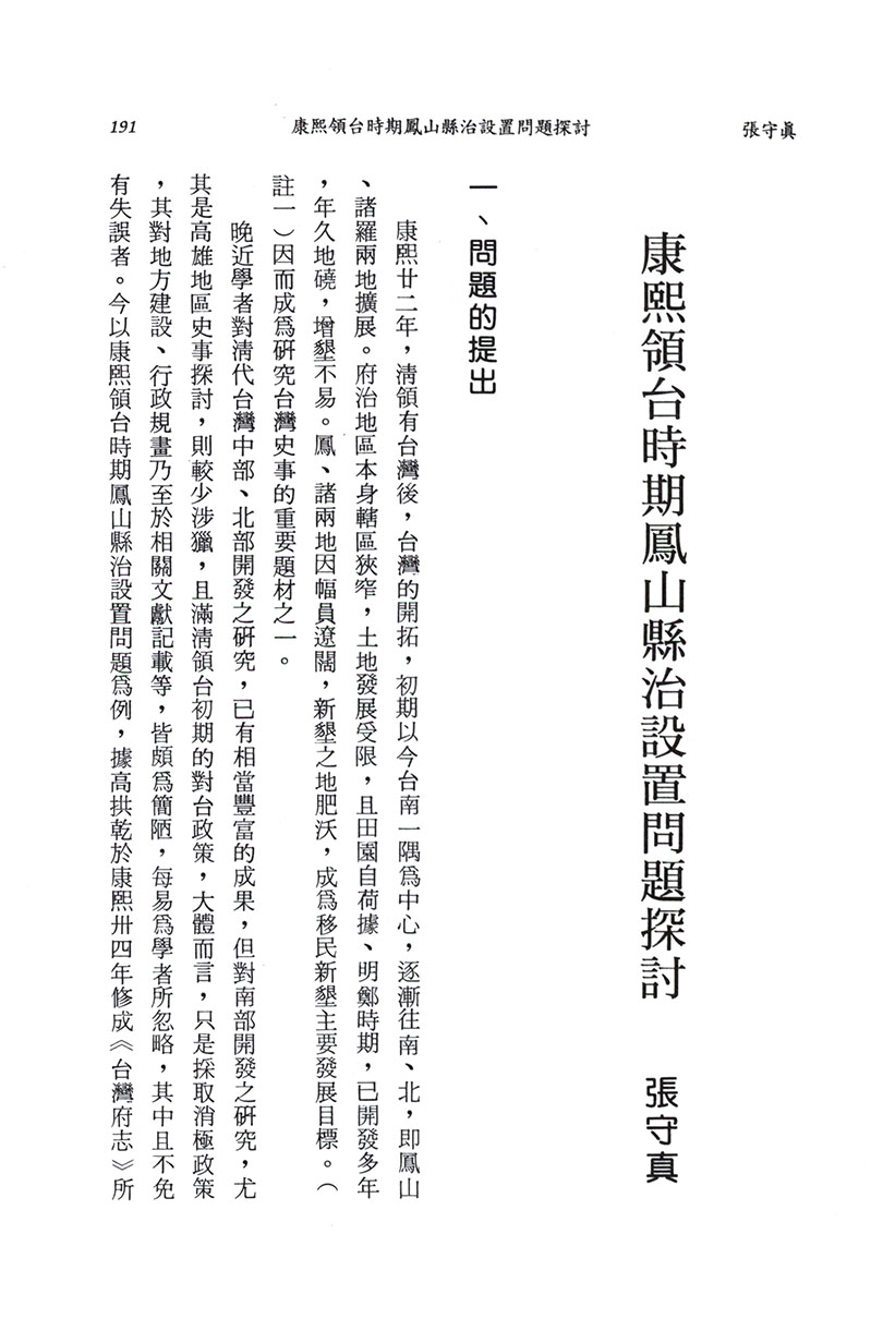 本文為探討臺灣清領前期康熙年間鳳山縣治的設置問題,以大量史料來加以論證的方式,並釐清縣治設置的位置、動機與考量因素等問題。