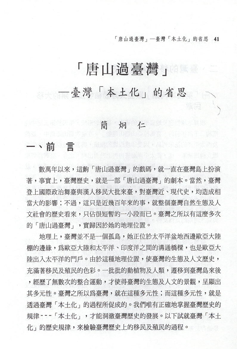 本文描述因臺灣地理位置的獨特性,造就了臺灣本土的生態與文化歷史的多元化,並透過移民與殖民史的角度,來觀察臺灣歷史的發展。