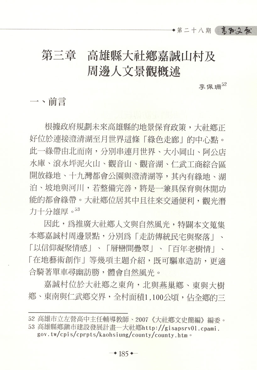本篇為一村落景觀介紹文章,係為推廣大社鄉人文與自然風光,以大社鄉嘉誠村為主軸,介紹該村落周邊人文聚落與地理自然景觀。並希望藉由介紹嘉誠村的美景,以增加大社鄉的觀光資本。