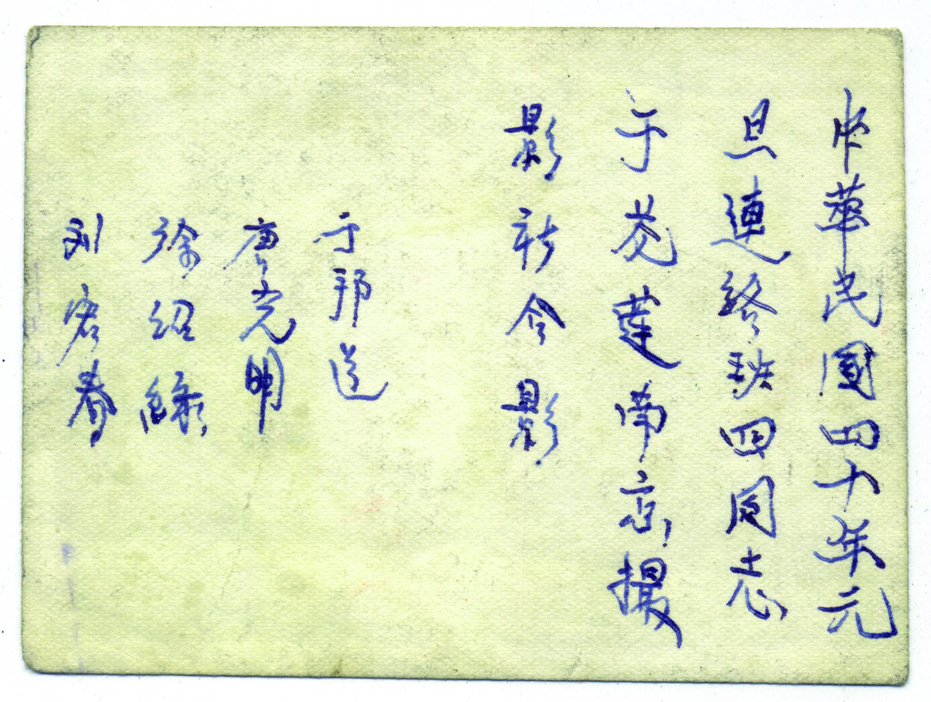 圖片為聯絡班四同志於花蓮南京攝影社合影照片的背面,上面寫著「中華民國四十年元旦聯絡班四同志于(於)花蓮港南京撮影社合影」等字樣,左邊四個名字「于邦達、唐光明、徐紹緣、劉宏春」應該就是照片中的四位服役青年。花蓮也曾有許多照相館存在,可謂照相館的黃金時期。當時經營照相館是一份收入優渥的行業,日治時期多為日本人經營。隨著科技普及,拍照已然成為現代人的日常,這個產業也就漸漸凋零蕭落。而值得注意的是當初拍攝這張照片的南京攝影社至今仍在中華路64號繼續經營著,走過一甲子,拍過許多照片,也見證整個時代花蓮的轉變。本資料出自於《顧我洄瀾:花蓮歷史影像集》,此書由花蓮出身的葉柏強先生撰寫,是一本擁有大量歷史影像的書籍,於2016年(民國105年)出版,可以透過此書了解花蓮的城市變遷樣貌。