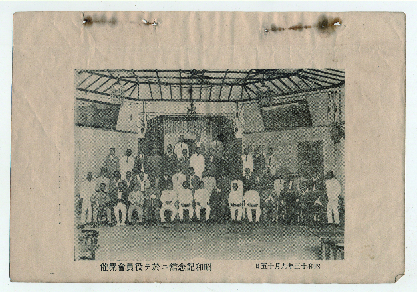 此圖為〈昭和記念テ於ニ役員會開催〉,於1938年(昭和13年)出版,從印刷品中可以看到當時大廳內懸掛兩張以山景為主題的畫作,可能是油畫,1980年代後昭和紀念館建築物消失,這兩張畫作應該永遠失落了。「昭和紀念館」於1928年(昭和3年)完工,座落於日治時期的花蓮港廳花岡山上,由當時在的地阿美族人集資出力所建成,最初建設的目的是為了保存阿美族人在花蓮的開墾史,並將其取名為「阿美族會館」,當中陳列了許多阿美族的生活器物,並作為族人前來花蓮的投宿之地,也是當地使用率最高的公開室內場所,並一度做為消防隊隊址。戰後,昭和紀念館被國防部接收。1986年(民國75年)原建築遭拆除,改建為現在的花蓮國軍英雄館。本資料出自於《顧我洄瀾:花蓮歷史影像集》,此書由花蓮出身的葉柏強先生撰寫,是一本擁有大量歷史影像的書籍,於2016年(民國105年)出版,可以透過此書了解花蓮的城市變遷樣貌。