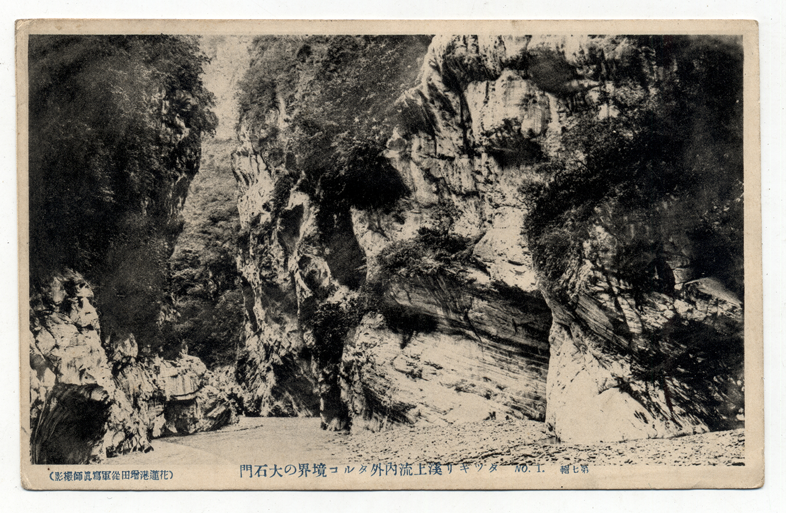 這張照片攝於塔次基里溪上游內外,塔次基里溪(Tkilig)為太魯閣族部落的名稱,也用來命名周遭溪流,1950年代的地圖上可見塔次基里溪為日文片假名音譯,1960年代改名為立霧溪,為去日本化的地名展現,太魯閣境界的大石門處,雖非彩色照片,但仍可以從圖片上看到清楚的岩壁紋理線條。照片的拍攝者為花蓮港增田從軍寫真師,雖為當時軍事行動的記錄,卻也因此留下早期的太魯閣景象,這張風景照也被作為繪葉書發行。此圖攝影於1914年(大正3年)太魯閣戰爭年間。太魯閣戰爭由當時的臺灣總督佐久間左馬太擔任討伐軍的司令,大舉進攻欲鎮壓的太魯閣部落,兩千多名族人奮勇抵抗,戰火激烈,歷時兩個月後,於8月28日由臺灣總督府宣告戰爭結束。戰爭結束後,太魯閣地區設新城支廳與內太魯閣支廳,並派步兵中隊於海鼠山駐紮。此影像收錄於《顧我洄瀾:花蓮歷史影像集》一書,為葉柏強先生撰寫、花蓮縣文化局於2016年(民國105年)出版。書中記錄了花蓮近百年的城市樣貌,是一本擁有豐富文史與圖像資料的書籍。