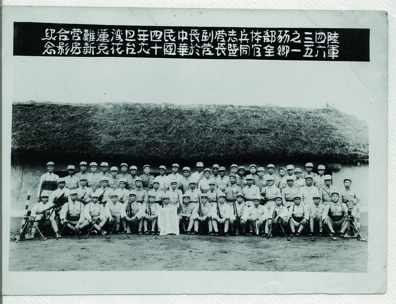 從此照片為陸軍部隊於花蓮克難新營房前的合影,照片上方標題寫著:「陸軍四六三五之一(此字不識)鄉部全體官兵同志暨營長副營長於中華民國四十年元旦台灣花蓮克難新營房合影紀念」,然而無法知道其詳細之地點位於何處。此陸軍部隊應該為1949年(民國38年)後跟著中華民國政府一同來到臺灣之後在花蓮落腳的其中一支部隊。從士兵手上的錦旗可以清楚地看見「藝高膽大」四個字。而在部隊身後一排的茅草應該就是當時標題中的克難新營房,克難新營房是以茅草為屋頂。此影像收錄於《顧我洄瀾:花蓮歷史影像集》一書,為葉柏強先生撰寫、花蓮縣文化局於2016年(民國105年)出版。書中記錄了花蓮近百年的城市樣貌,是一本擁有豐富文史與圖像資料的書籍。